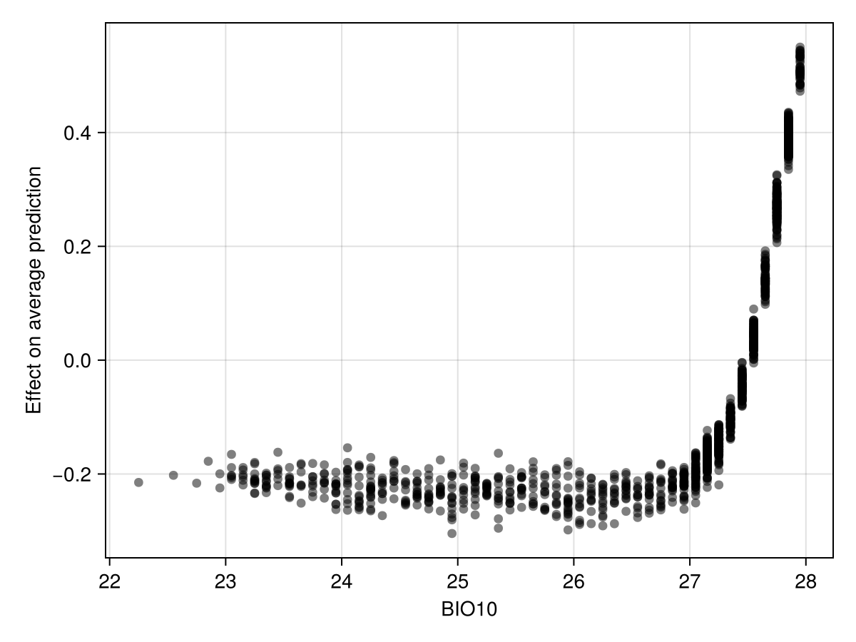 Colorbar(f[1, 3], hm)We can look at the partial response to the variable that was included first in the model, in order to understand how it translates into a high predicted value: