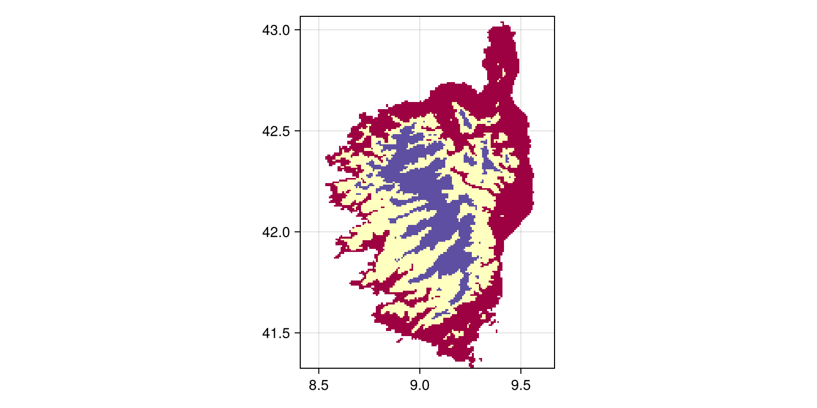 🗺️ A 209 × 151 layer (14432 Float64 cells)The syntax is the exact same as the Clustering package, with the feature matrix replaced by the vector of layers. For example, k-means with k=3 on these input data is done with: