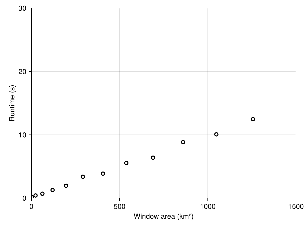 ax = Axis(f[1, 1]; xlabel = "Window area (km²)", ylabel = "Runtime (s)")