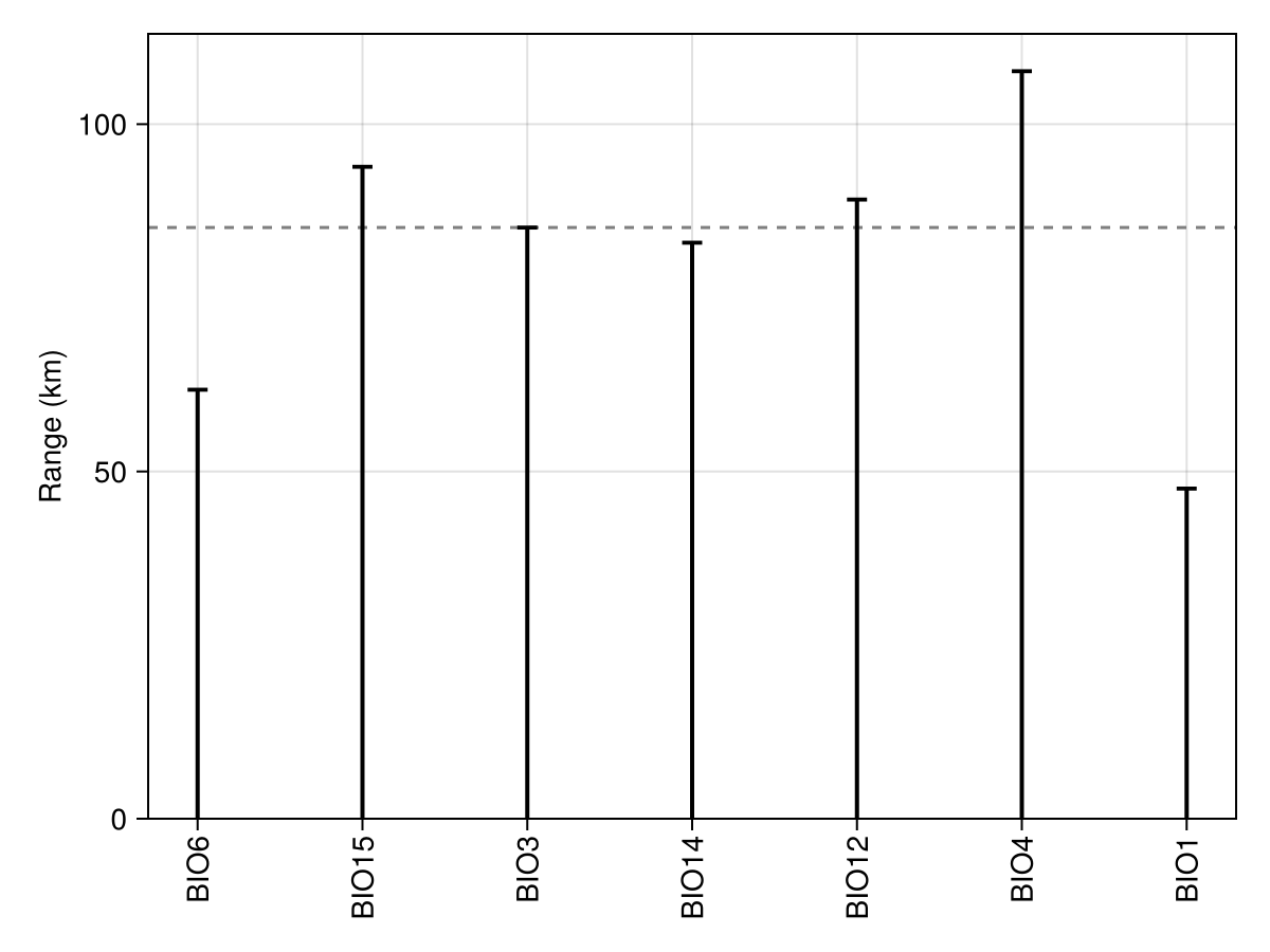 ax = Axis(f[1, 1]; ylabel = "Range (km)", xticks = xticks, xticklabelrotation = π / 2)
