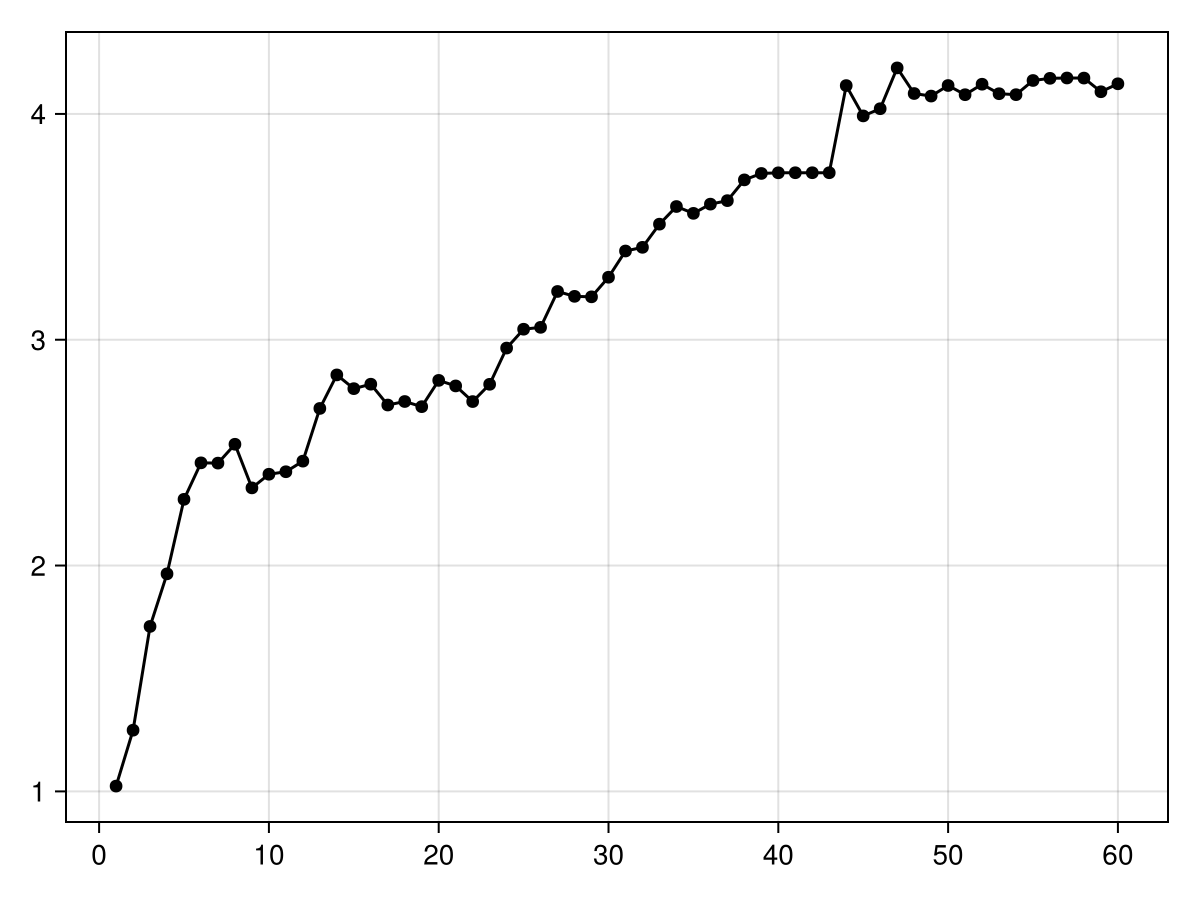 scatterlines(cumsum(bst.weights); color = :black)This is close enough. We can now apply this model to the bioclimatic variables: