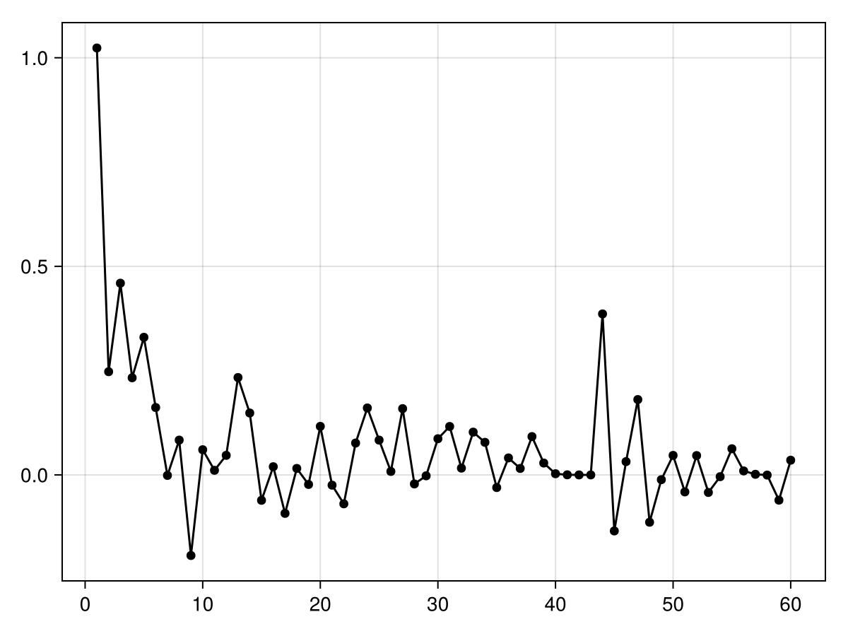 scatterlines(bst.weights; color = :black)Models with a weight of 0 are not contributing new information to the boosted model. These are expected to become increasingly common at later iterations, so it is a good idea to examine the cumulative weights to see whether we get close to a plateau.