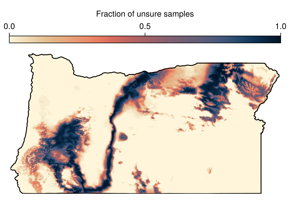 Colorbar(f[1, 1], hm; label = "Fraction of unsure samples", vertical = false)