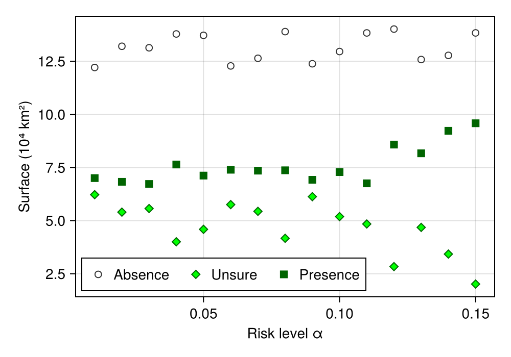 ax = Axis(f[1, 1]; ylabel = "Surface (10⁴ km²)", xlabel = "Risk level α")