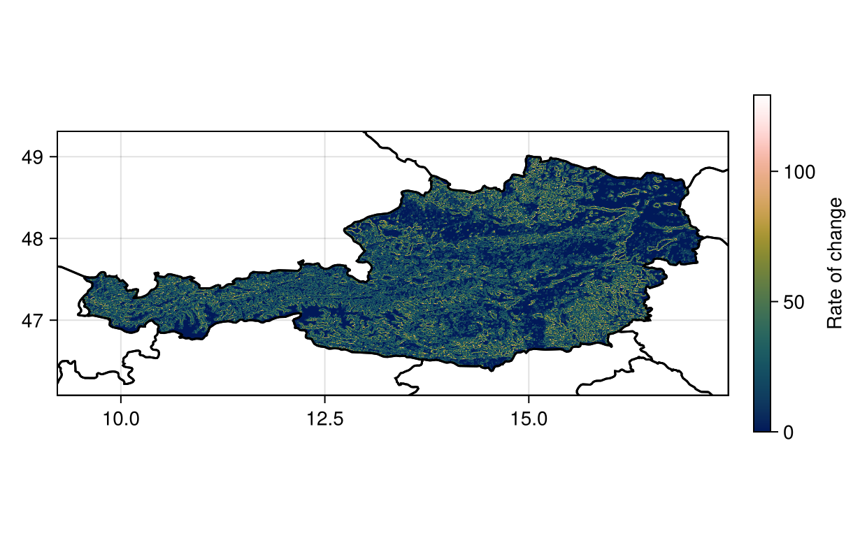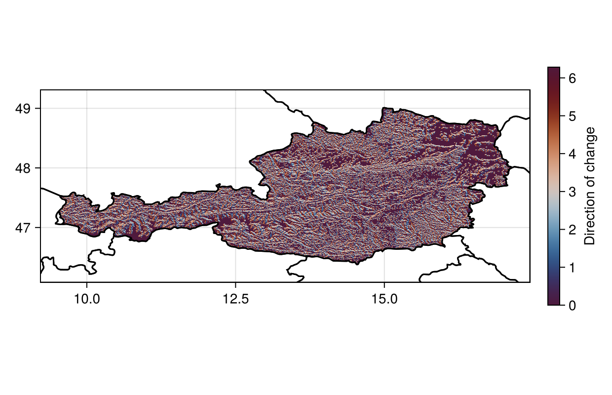 Colorbar(f[1,2], hm, label="% of tree cover", height=Relative(0.7))Because there are several layers, we can pass them to the wombling function directly, to return the mean rate and mean angular direction:
