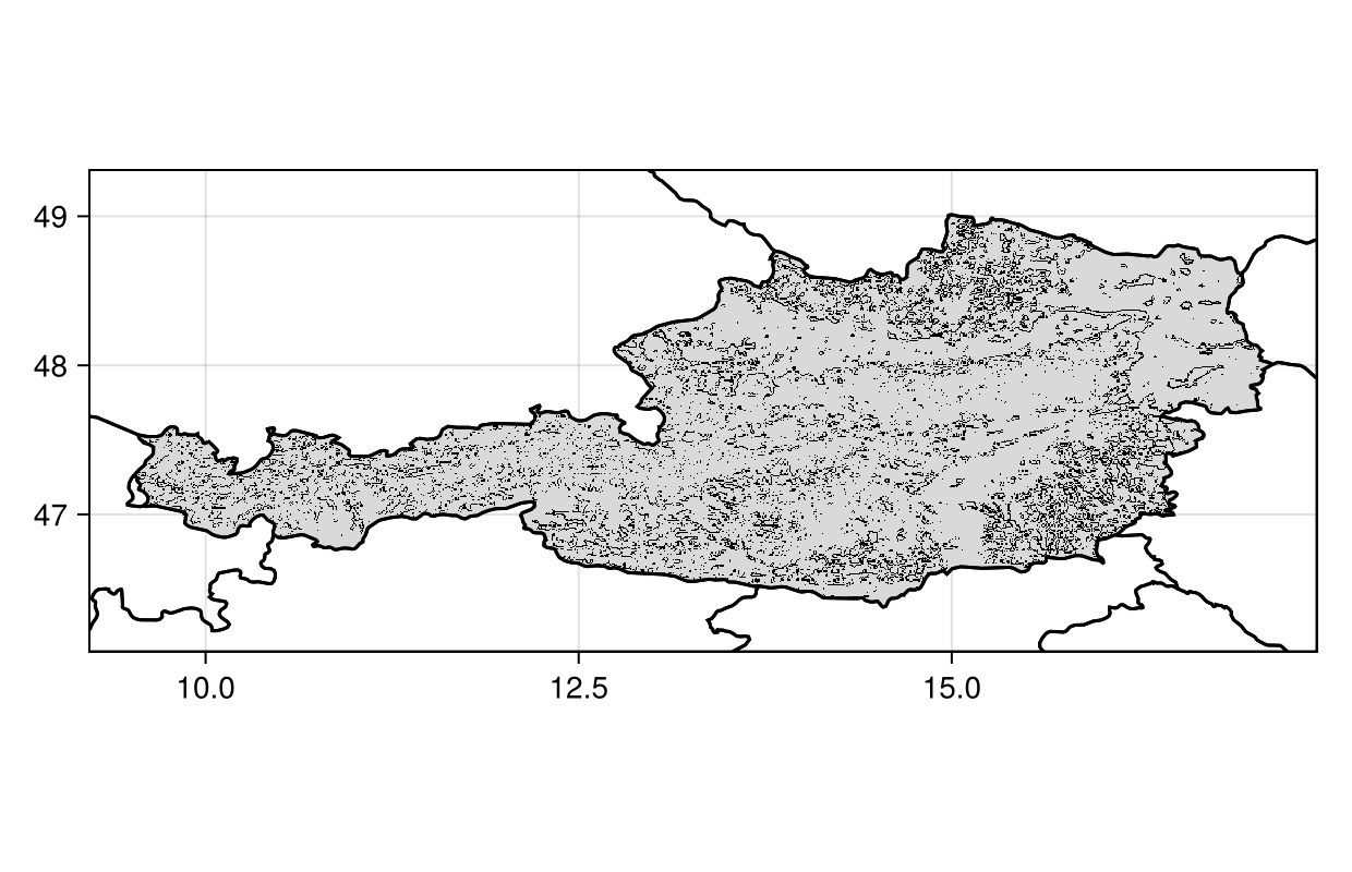using CairoMakieThe SpatialBoundaries package works with SpeciesDistributionToolkit through an extension, so that you can get access to the integration when SpatialBoundaries is loaded in your project: