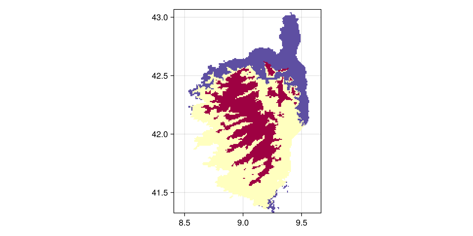 🗺️ A 209 × 151 layer (14432 Float64 cells)The syntax is the exact same as the Clustering package, with the feature matrix replaced by the vector of layers. For example, k-means with k=3 on these input data is done with: