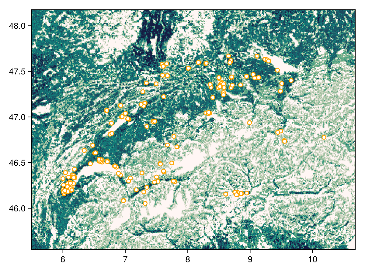 SpeciesDistributionToolkit.boundingbox(CHE; padding = 0.5)(left = 5.455832004547119, right = 10.992294311523438, bottom = 45.31795883178711, top = 48.30845260620117)SpeciesDistributionToolkit.boundingbox Function