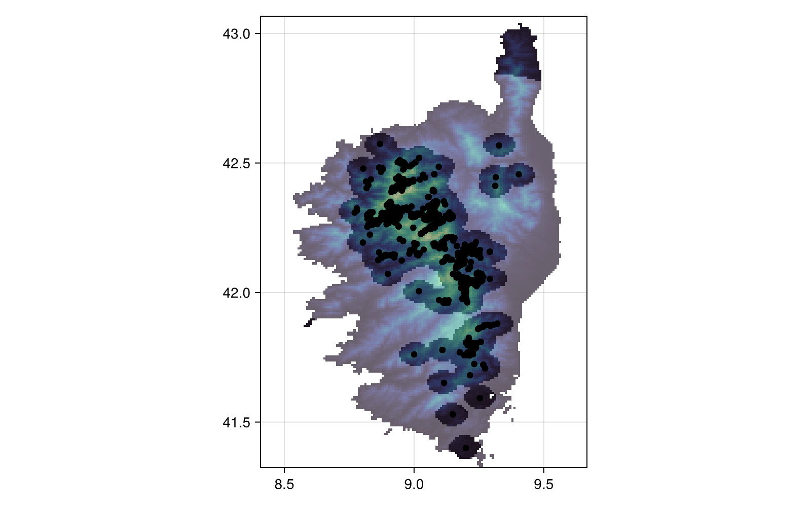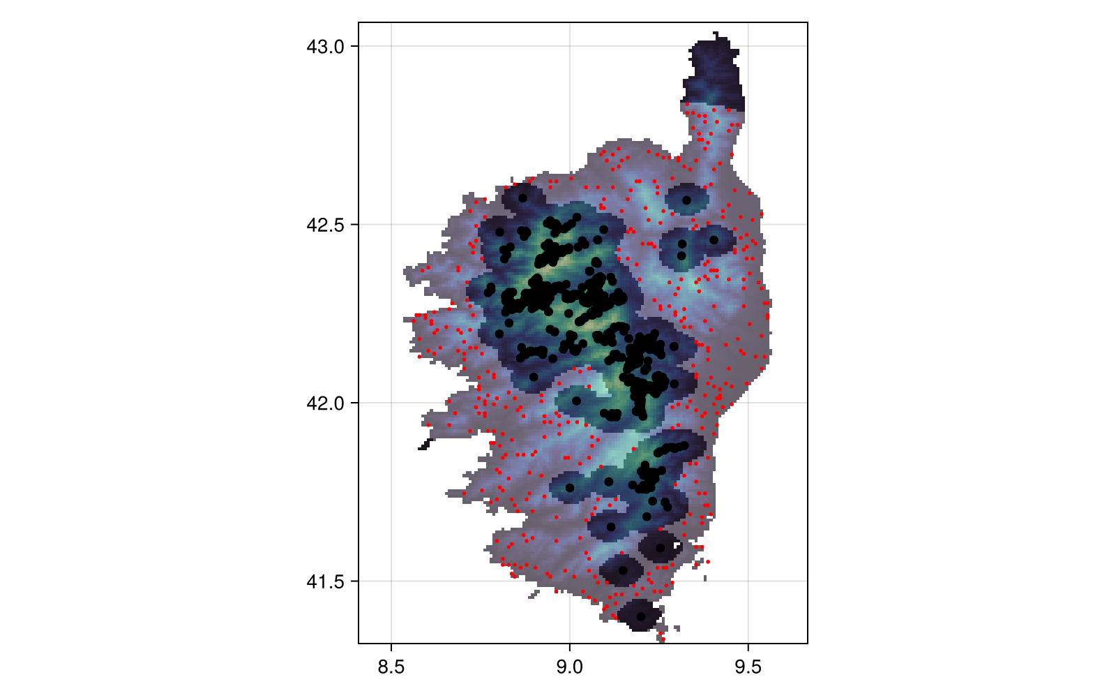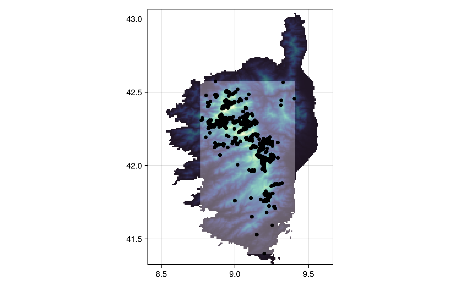 spatial_extent = (left = 8.412, bottom = 41.325, right = 9.662, top = 43.060)(left = 8.412, bottom = 41.325, right = 9.662, top = 43.06)Pseudo-absence generation requires occurrences super-imposed on a layer, so we will collect a few occurrences: