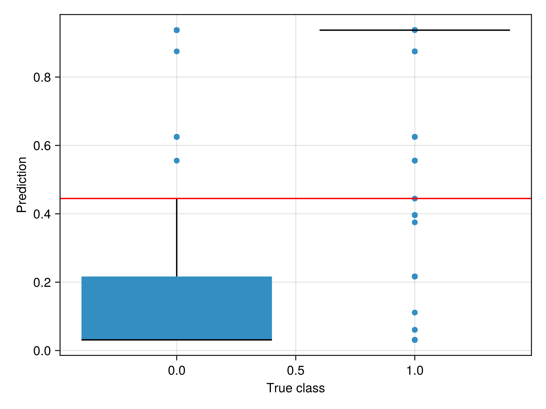 train!(sdm)PCATransform → DecisionTree → P(x) ≥ 0.445It is a good idea to also perform a sanity check, by verifying that the distribution of predicted values makes sense knowing their true label (the threshold is in red):