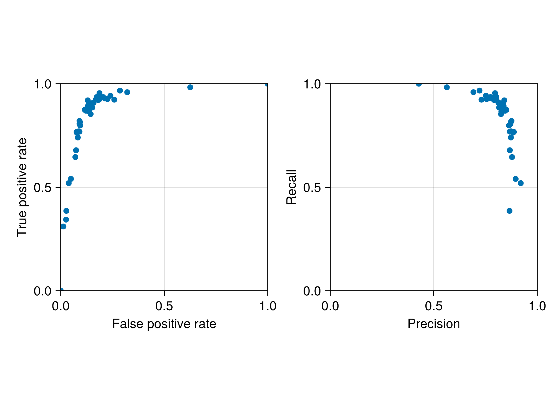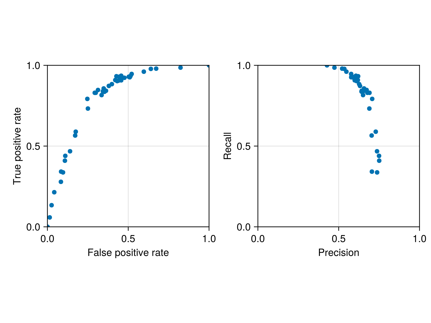 ax2 = Axis(f[1, 2]; aspect = 1, xlabel = "Precision", ylabel = "Recall")