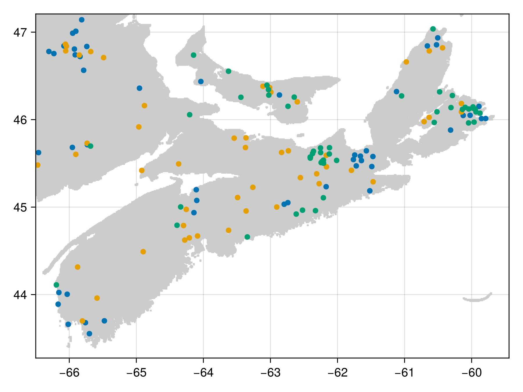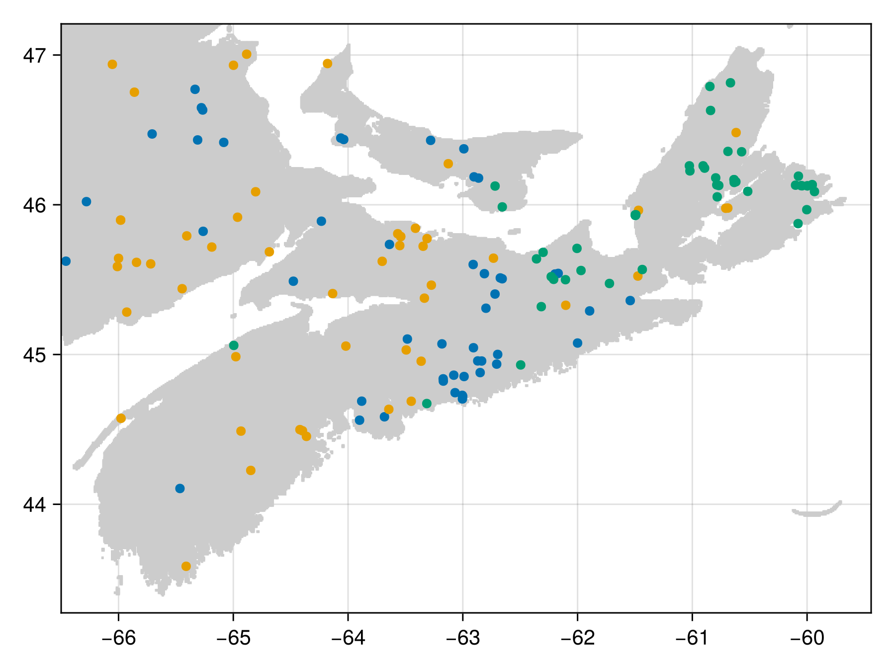 Get the observation data in the correct format, which is an array of matrices with two rows (longitude, latitude) and one column for observed occurrence. This is usually an array of observations that are a subtype of AbstractOccurenceCollection (data returned from the GBIF package work), but all that matters is that this is a matrix with longitudes in the first row, and latitudes in the second row. The matrix has to be column-major, with observations as columns. To make sure that we cover a reasonable spatial extent, we will look at the rather small area in space (part of the Gaspésie region):