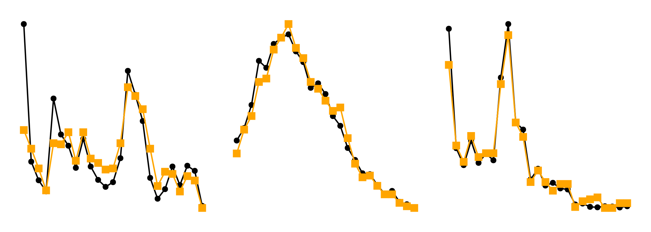 For the intra-specific distances, with observations in black and the simulation in orange, this looks like: