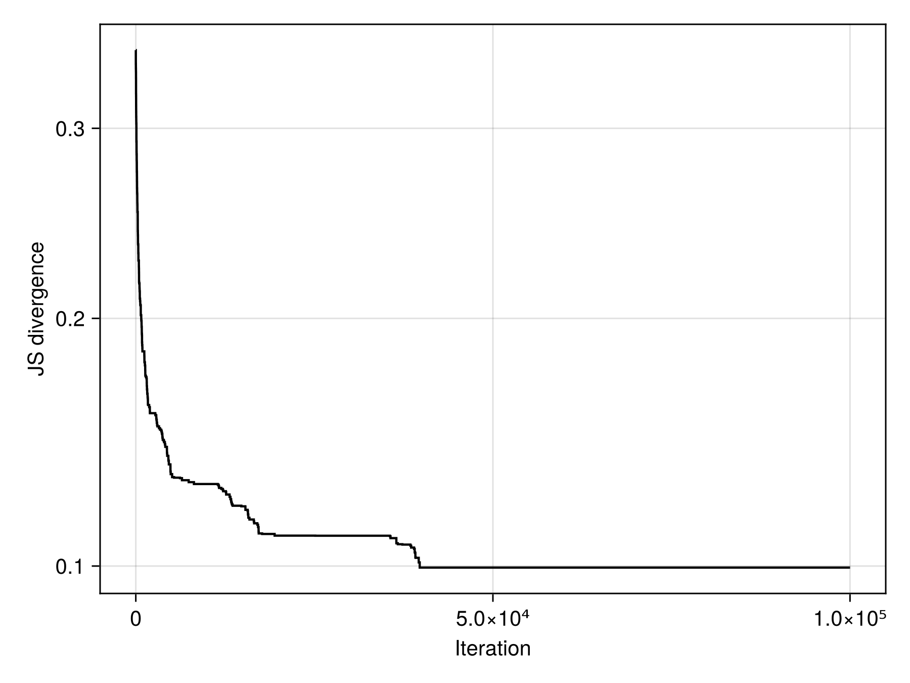 axis = (; yscale = sqrt, xlabel = "Iteration", ylabel = "JS divergence"),