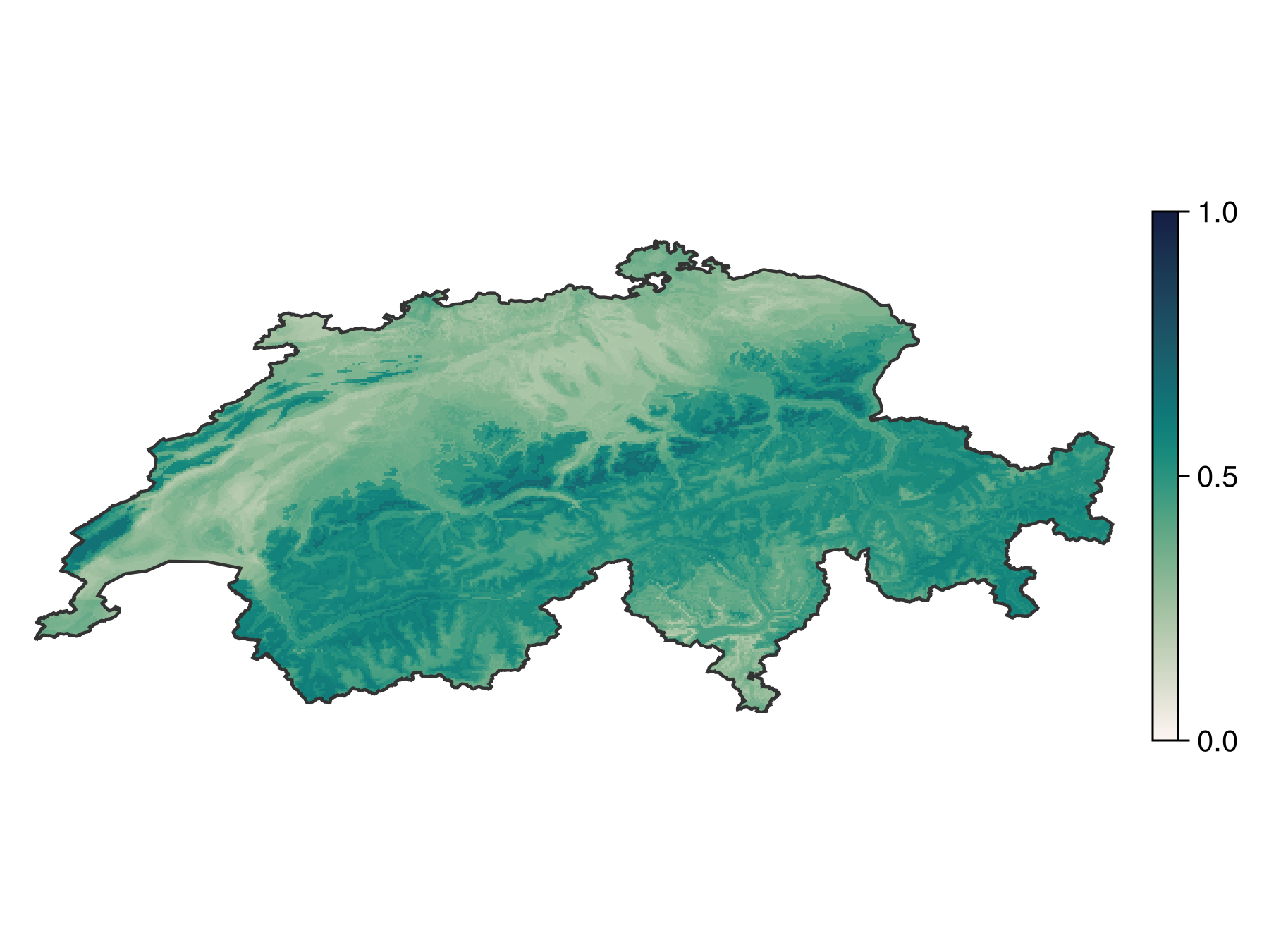 Of course the calibration function can be applied to a layer, so we can now use AdaBoost to estimate the probability of species presence. Dormann (2020) has several strong arguments in favor of this approach.