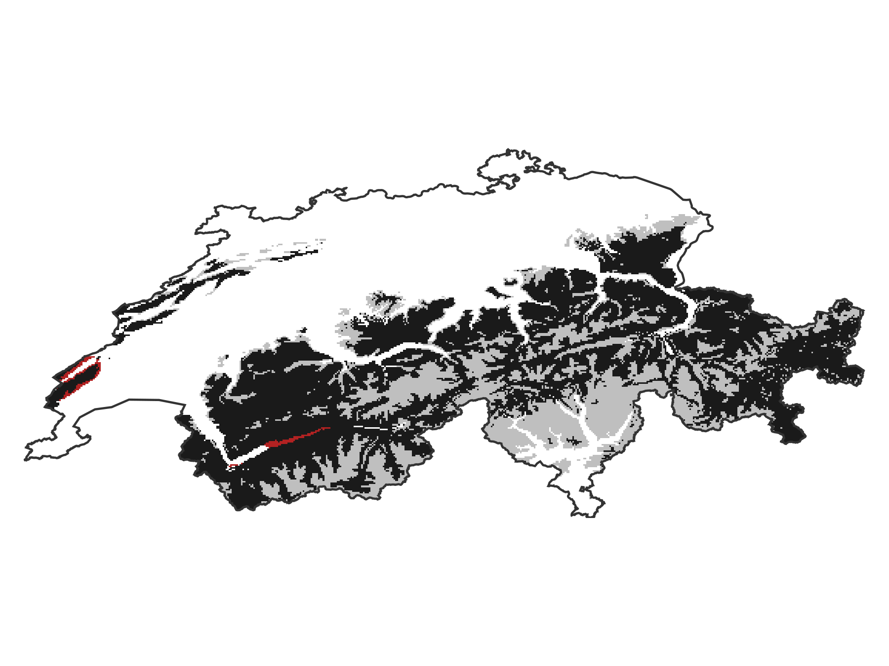 We now plot the difference, where the areas gained by boosting are in red, and the areas lost by boosting are in light grey. The part of the range that is conserved is in black.