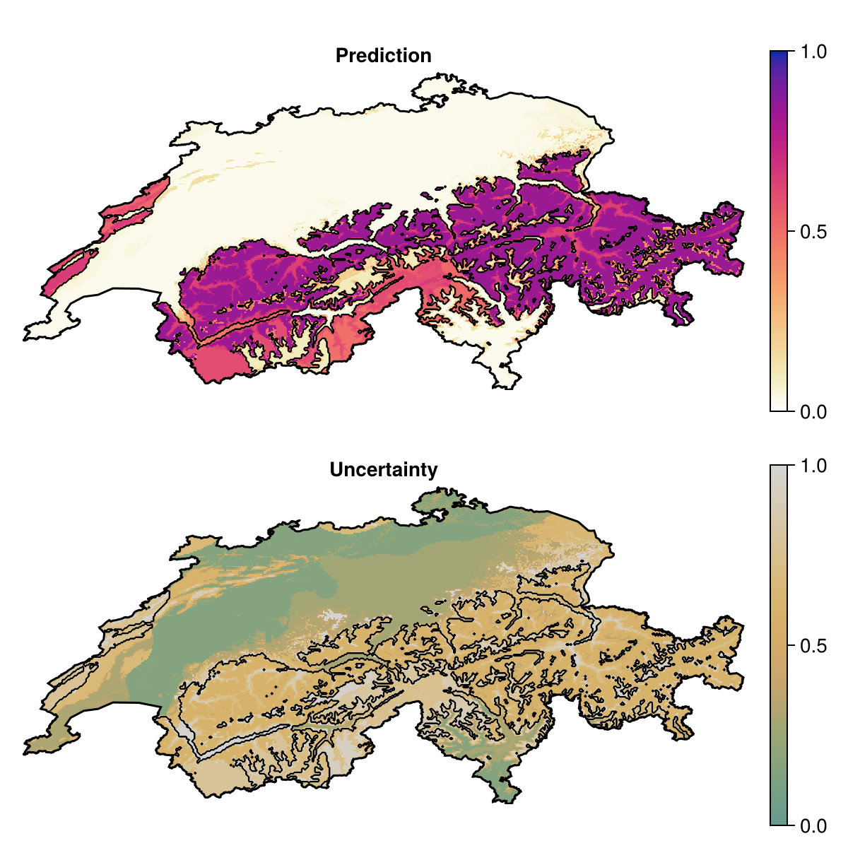 Projection: +proj=longlat +datum=WGS84 +no_defsWhen the model is trained, we can make a prediction asking to report the inter-quartile range of the predictions of all models, as a measure of uncertainty: