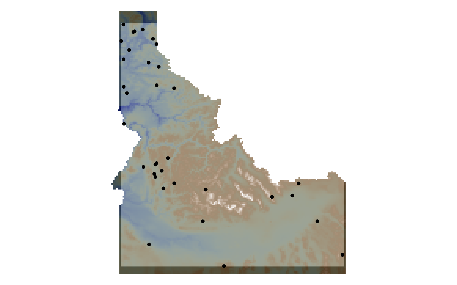 spatial_extent = SpeciesDistributionToolkit.boundingbox(landmass)(left = -117.24303436279297, right = -111.04356384277344, bottom = 41.988834381103516, top = 49.0008430480957)We will get a single layer (elevation, but it's not important here):