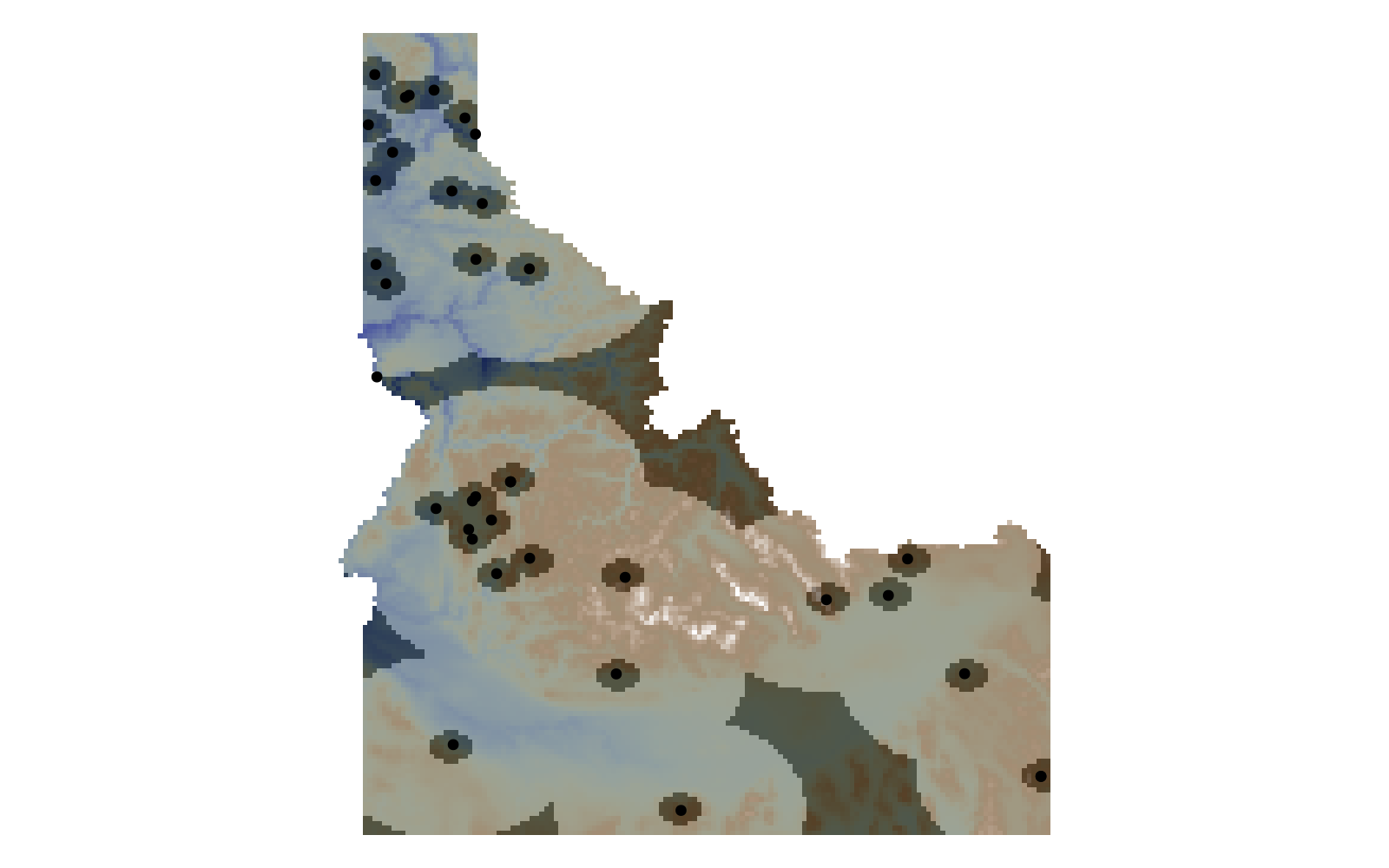 hidedecorations!(current_axis())The RandomSelection method (not shown) uses the entire surface of the layer as a possible pseudo-absence location.
