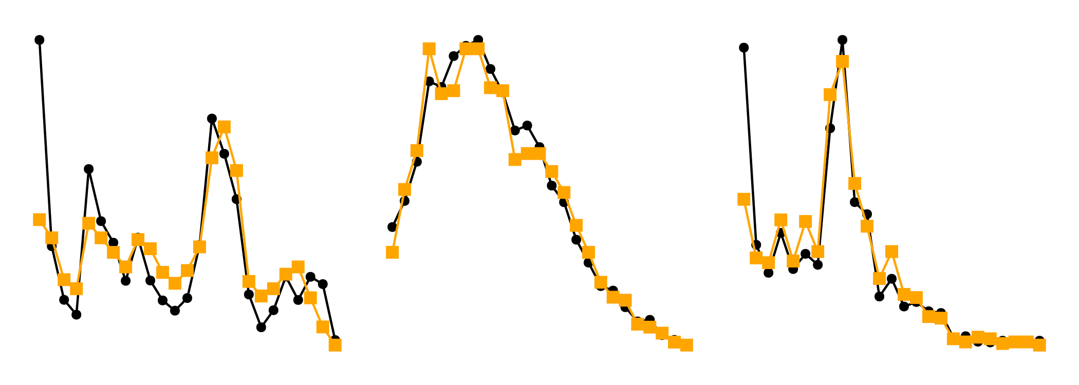 For the intra-specific distances, with observations in black and the simulation in orange, this looks like: