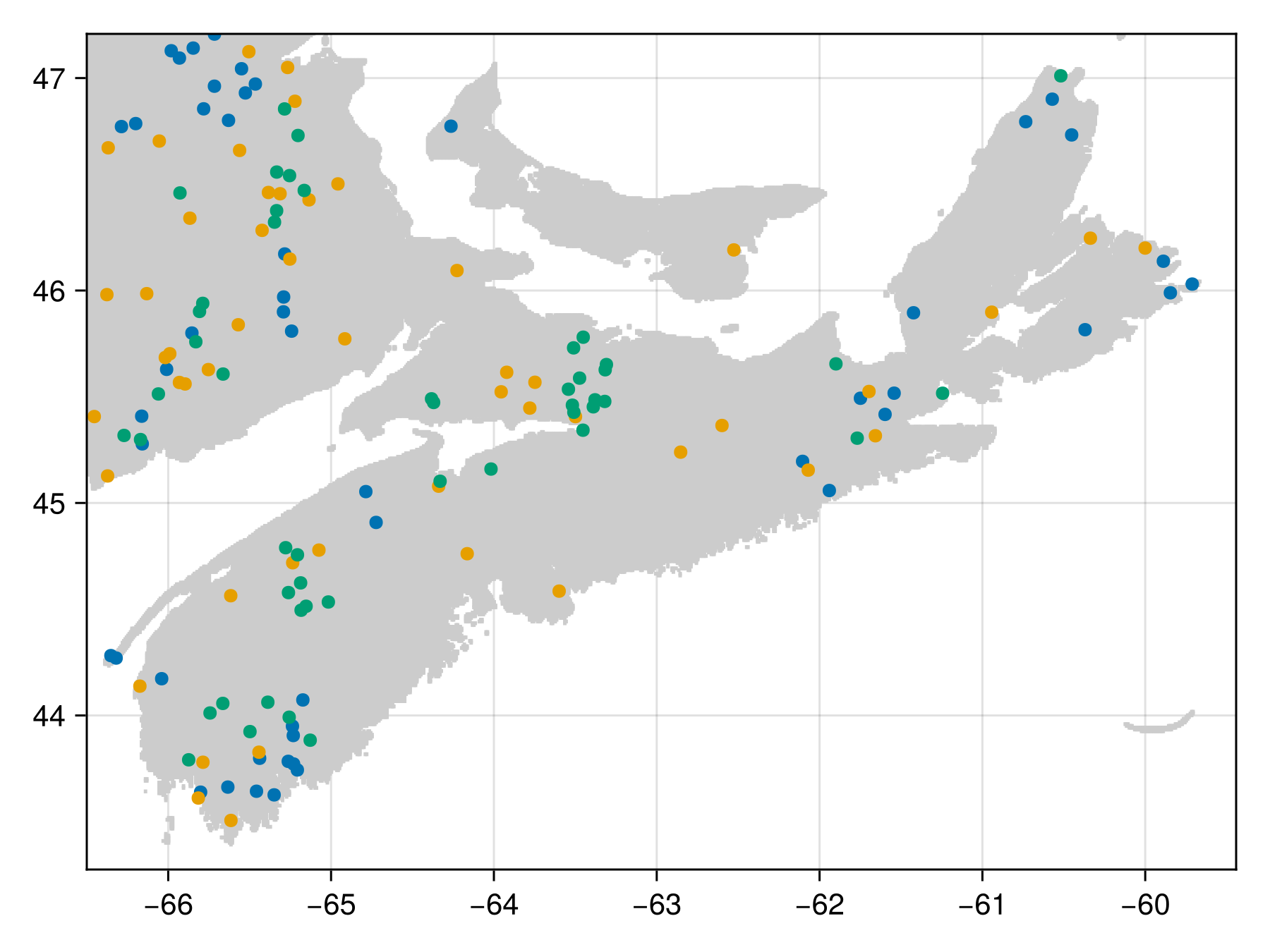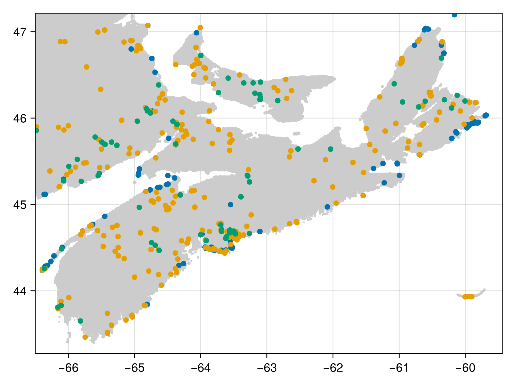 Get the observation data in the correct format, which is an array of matrices with two rows (longitude, latitude) and one column for observed occurrence. This is usually an array of observations that are a subtype of AbstractOccurenceCollection (data returned from the GBIF package work), but all that matters is that this is a matrix with longitudes in the first row, and latitudes in the second row. The matrix has to be column-major, with observations as columns. To make sure that we cover a reasonable spatial extent, we will look at the rather small area in space (part of the Gaspésie region):