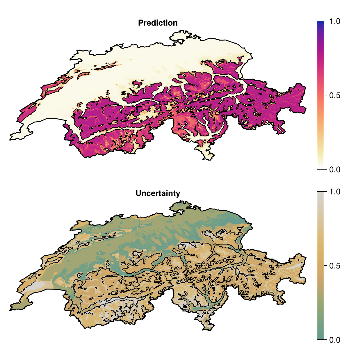 Projection: +proj=longlat +datum=WGS84 +no_defsWhen the model is trained, we can make a prediction asking to report the inter-quartile range of the predictions of all models, as a measure of uncertainty:
