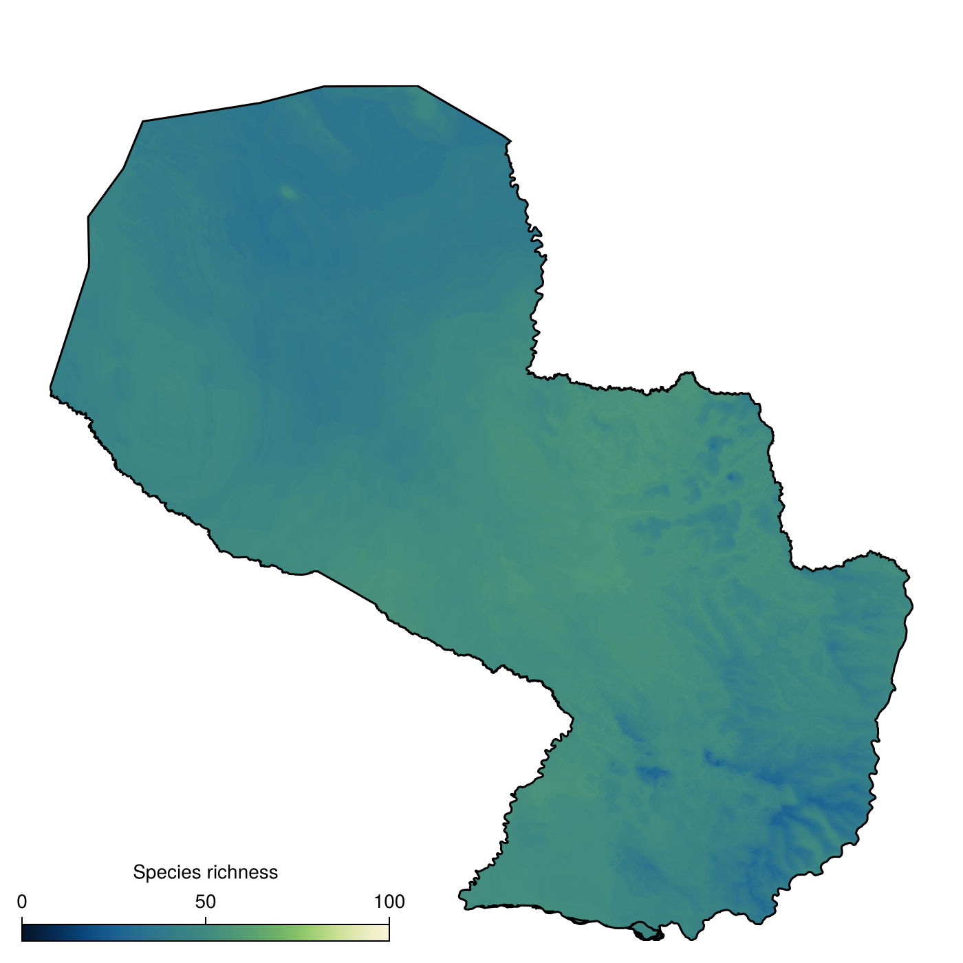 using StatisticsWe start by defining the extent in which we want to create the virtual species. For the purpose of this example, we will use the country of Paraguay. Note that the boundingbox function returns the coordinates in WGS84.