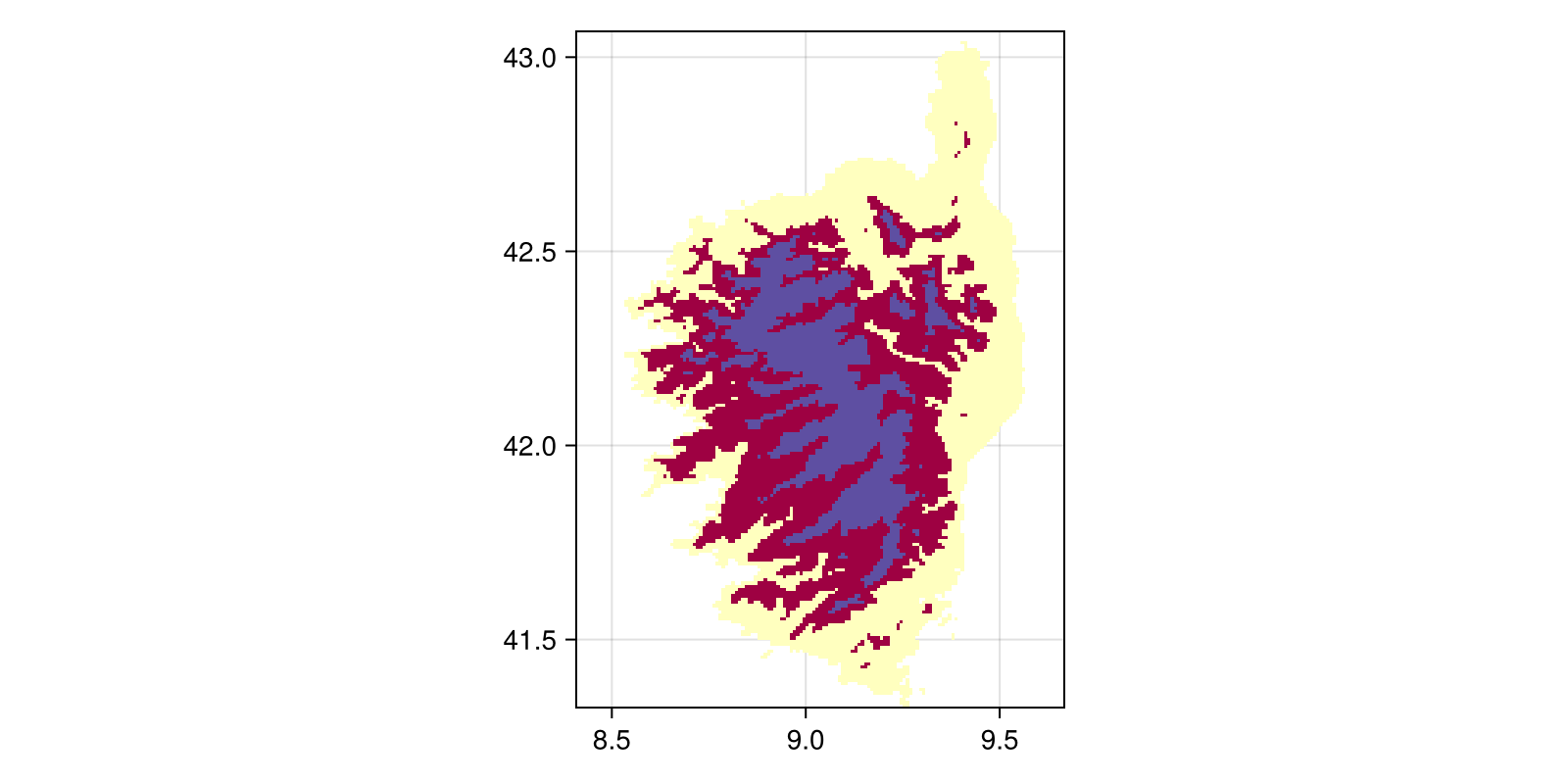 🗺️ A 209 × 151 layer (14432 Float64 cells)The syntax is the exact same as the Clustering package, with the feature matrix replaced by the vector of layers. For example, k-means with k=3 on these input data is done with:
