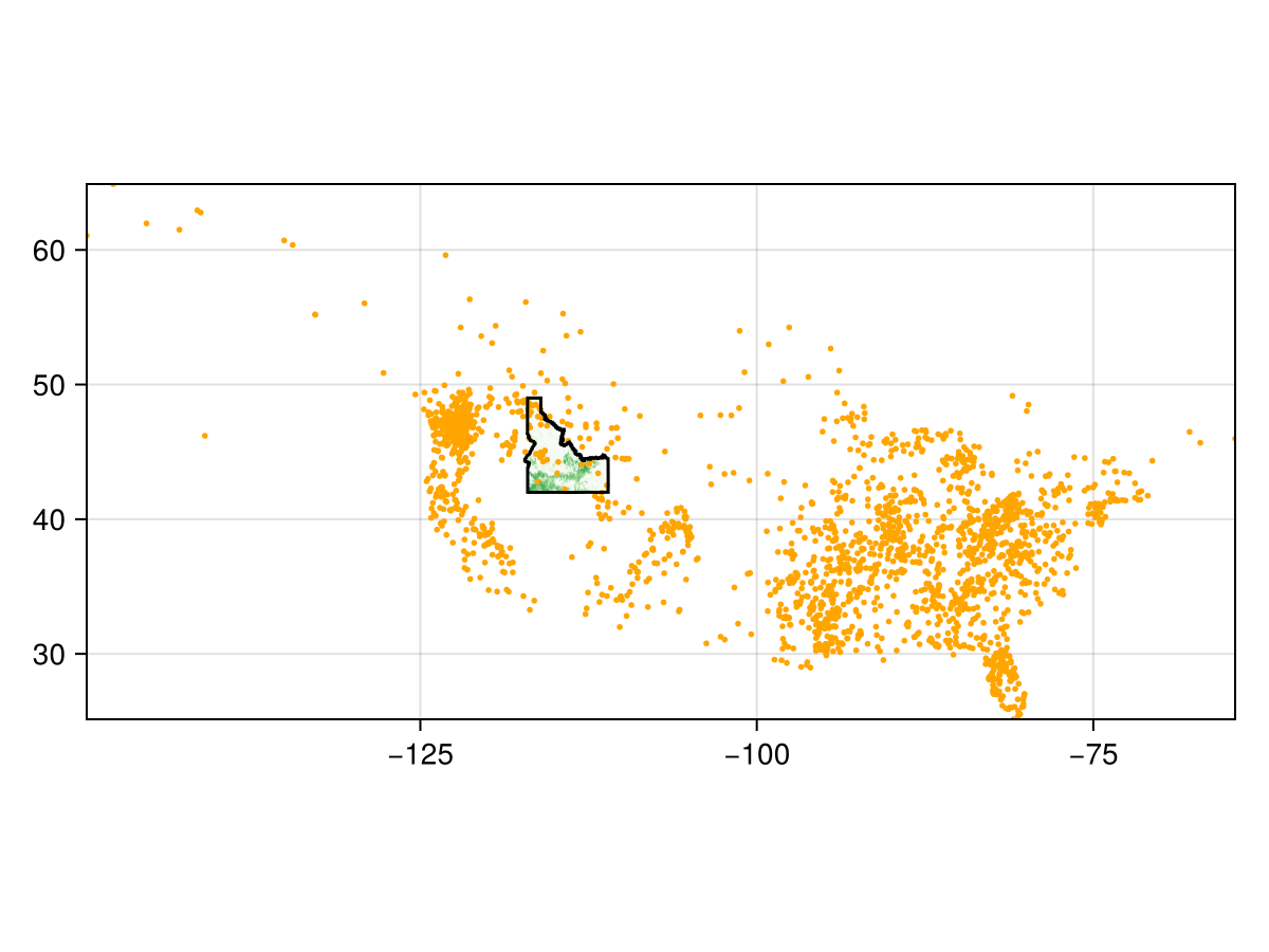 lines!(POL; color = :black)Let's now get some occurrences. The demonstration data from OccurrencesInterface are records of sightings of bigfoot (Lozier et al., 2009). These are useful data to think about species distribution modeling in slightly more abstract terms than using data on existing species, and slighty less abstract terms than simulated data (Foxon, 2024).