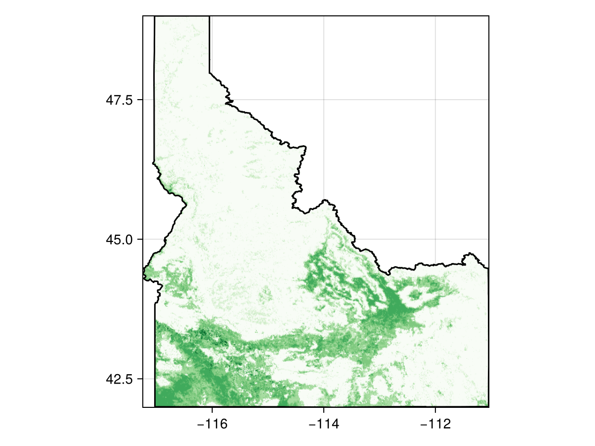 using CairoMakieIn this tutorial, we will mask a layer using information from a polygon, then use the same polygon to mask occurrence records.