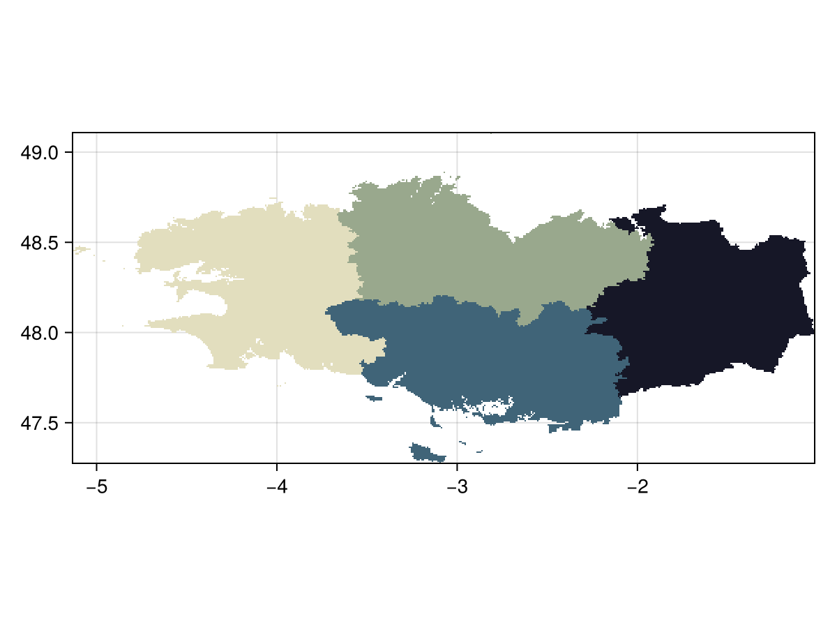 lines!.(DPTs)We can start looking at how the departments map onto the landscape, using the zone function. It will return a layer where the value of each pixel is the index of the polygon containing this pixel: