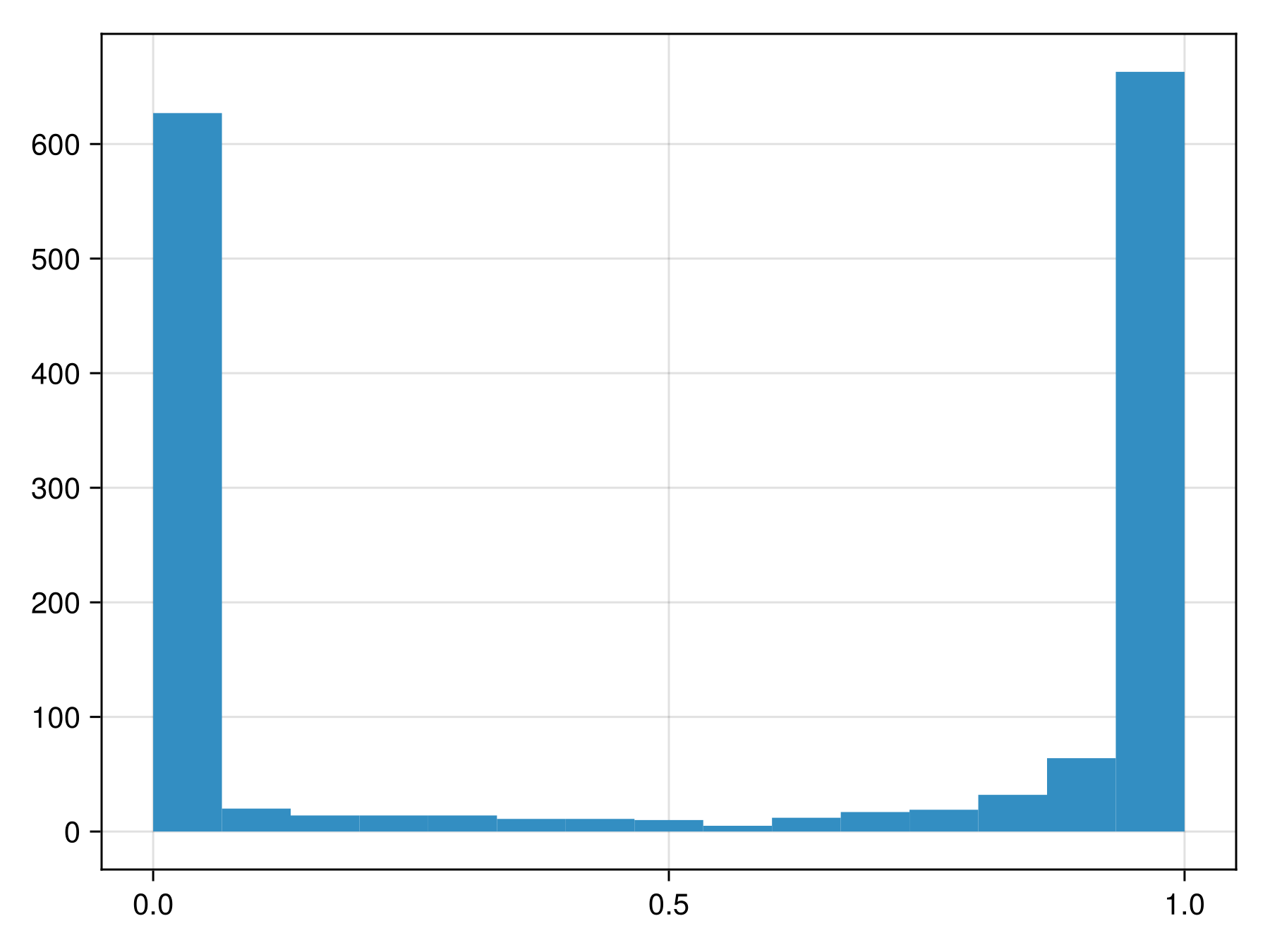 hist!(ax, predict(sdm; threshold=false))To figure out whether these are close to actual probabilities, we can look at the reliability curve