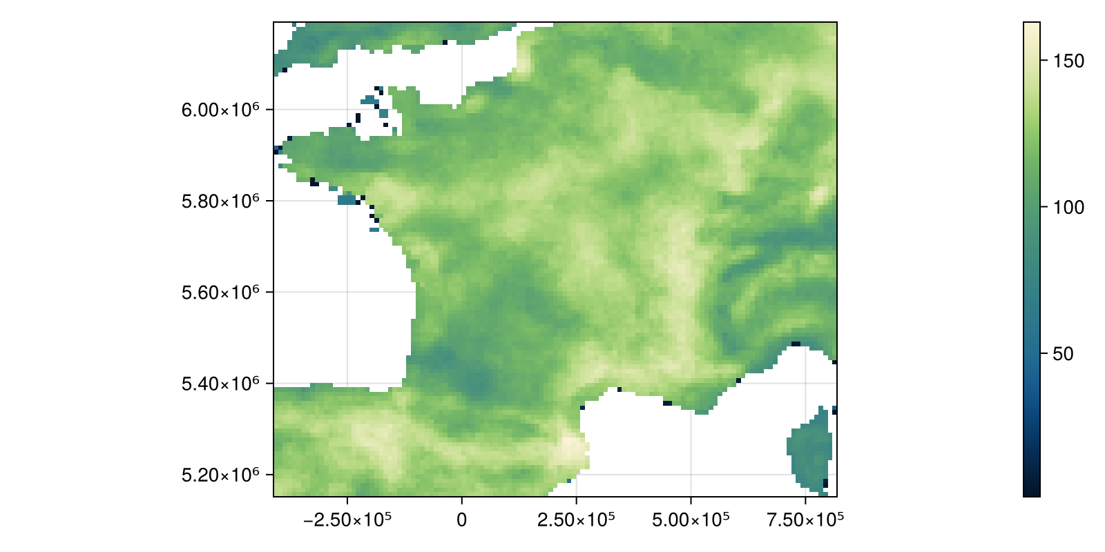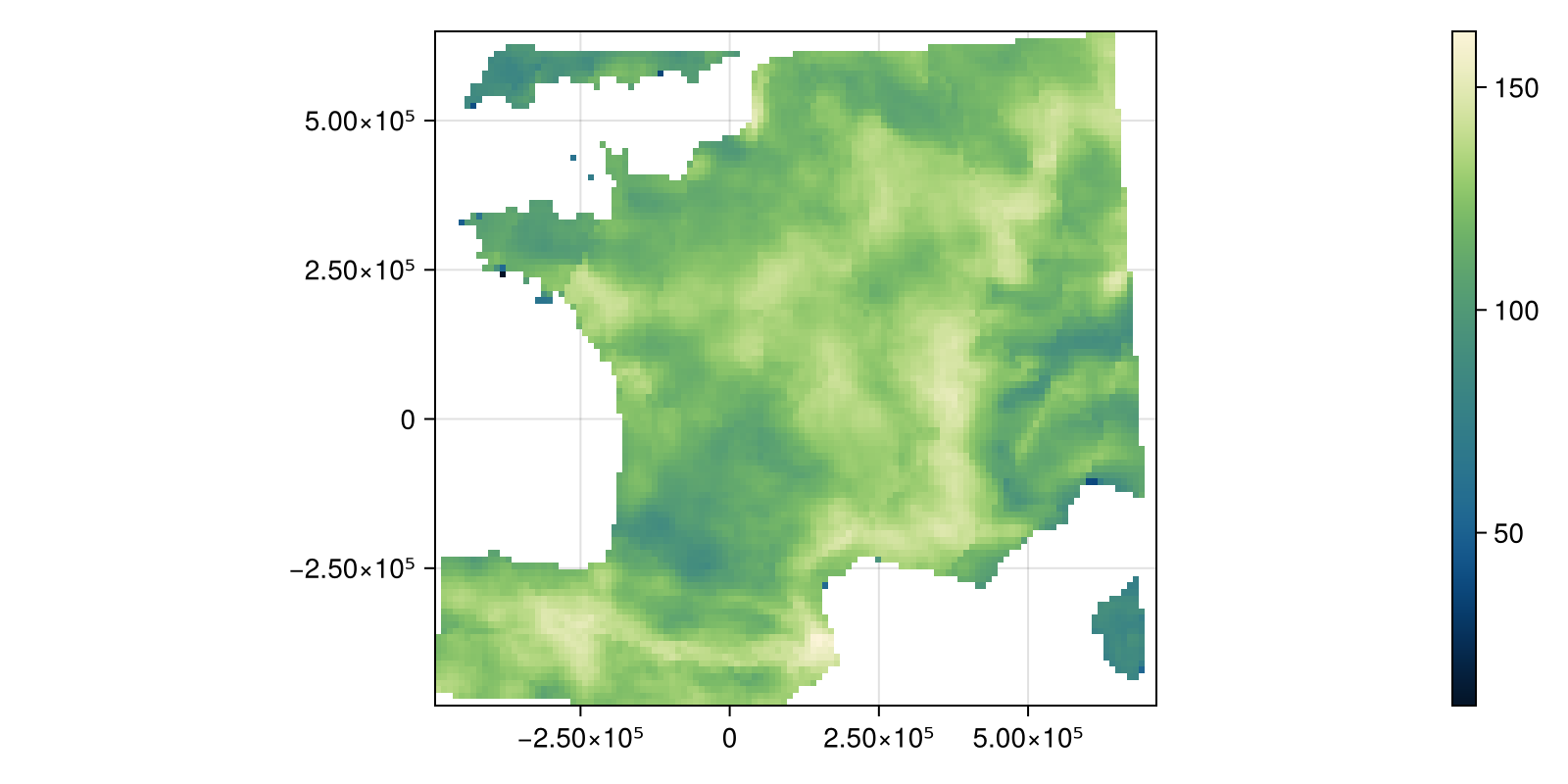 Colorbar(fig[:, end + 1], hm)And project them to the more locally appropriate EPSG:27574: