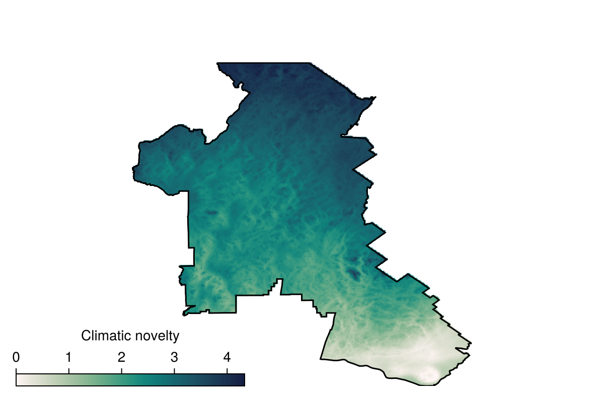 In this tutorial, we will download historical and projected future climate data, measure the climate novelty for each pixel, and provide a map showing this climate novelty.