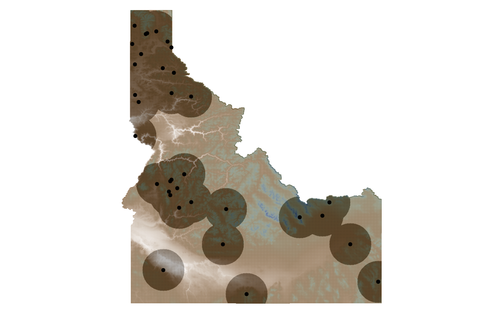 hidedecorations!(current_axis())We can also work with distances in degrees rather than kilometers – for example, this will create a rectangular buffer one degree wide and one degree tall around each observation. Using absolute=false will turn this into a square buffer: