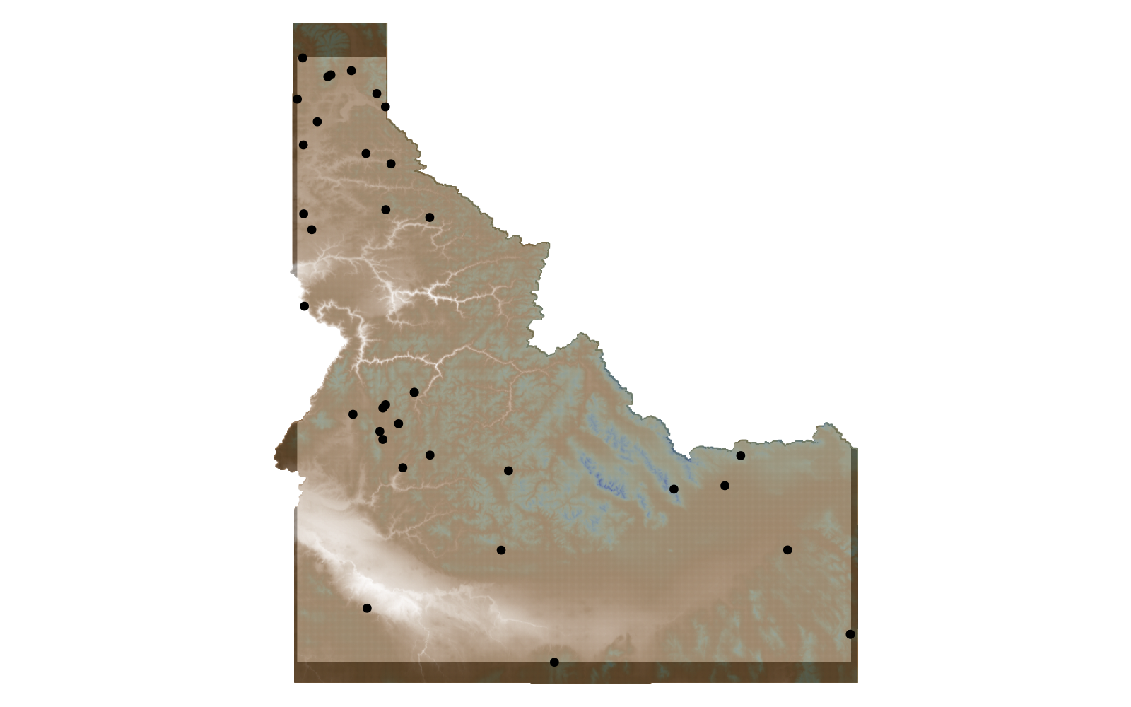 spatial_extent = SpeciesDistributionToolkit.boundingbox(landmass)(left = -117.24303436279297, right = -111.04356384277344, bottom = 41.988834381103516, top = 49.0008430480957)We will get a single layer for the illustration: