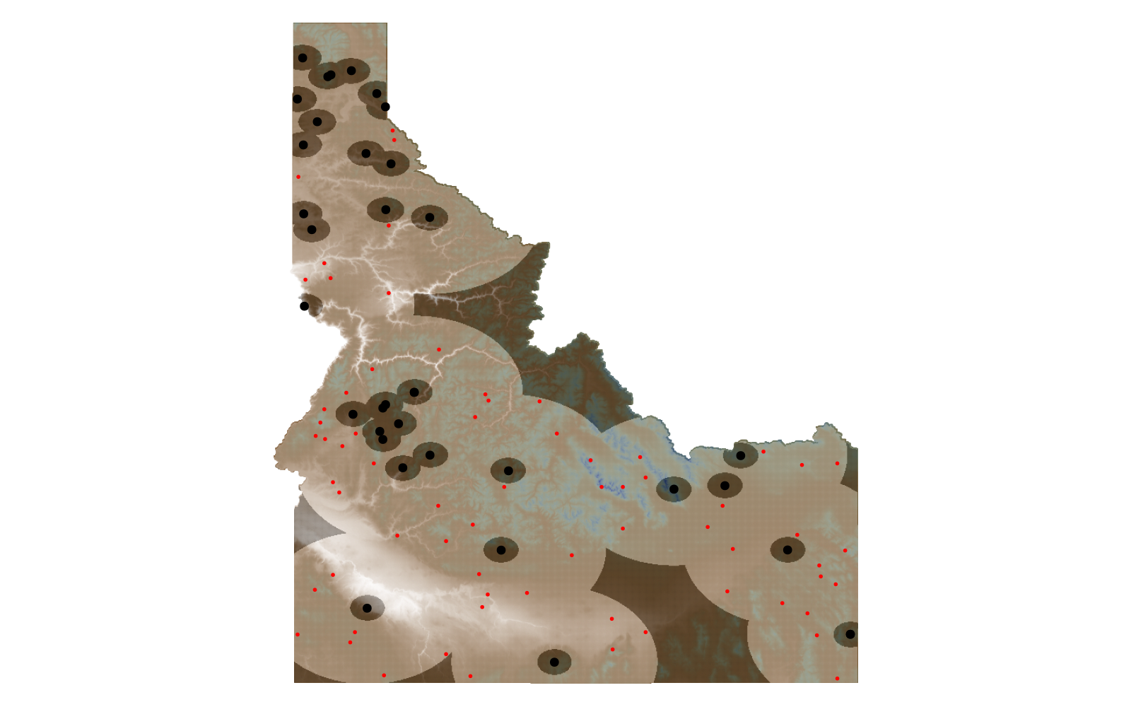 hidedecorations!(current_axis())The RandomSelection method (not shown) uses the entire surface of the layer as a possible pseudo-absence location.