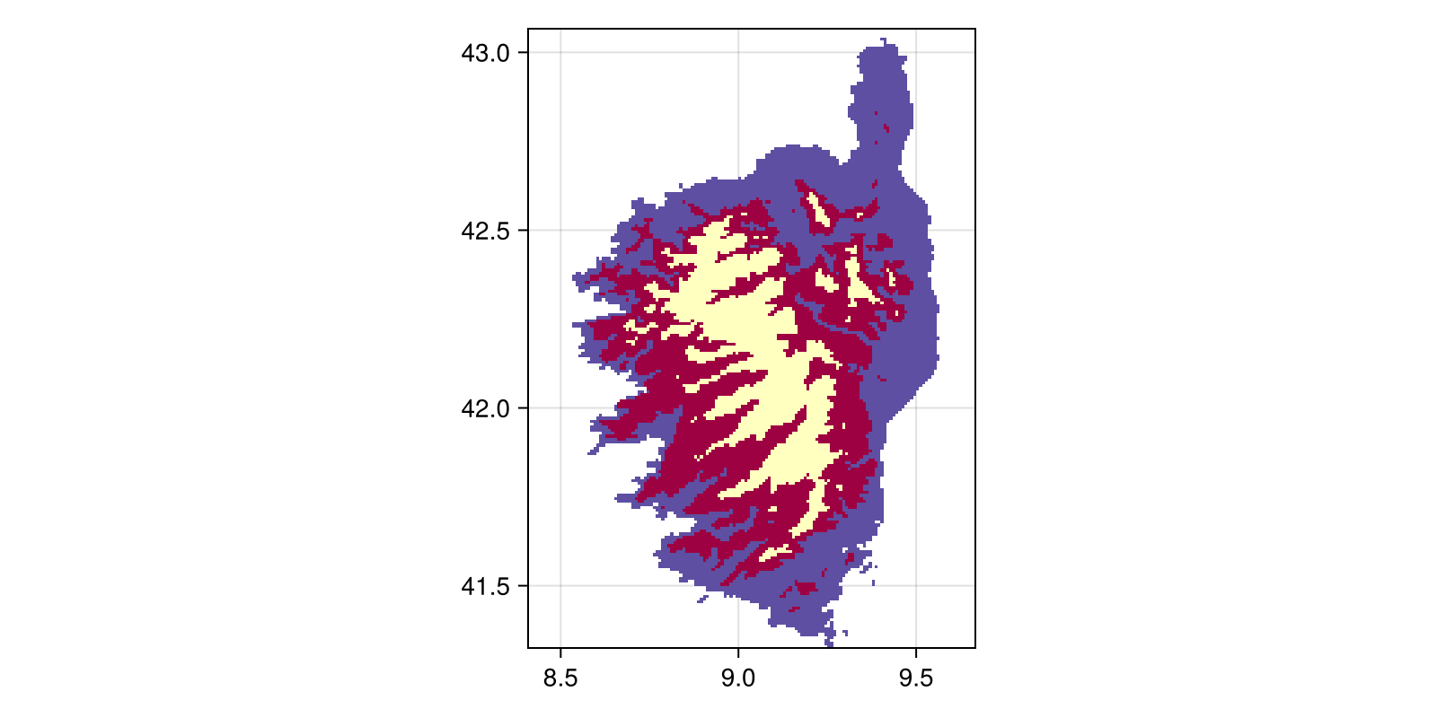 🗺️ A 209 × 151 layer (14432 Float64 cells)The syntax is the exact same as the Clustering package, with the feature matrix replaced by the vector of layers. For example, k-means with k=3 on these input data is done with: