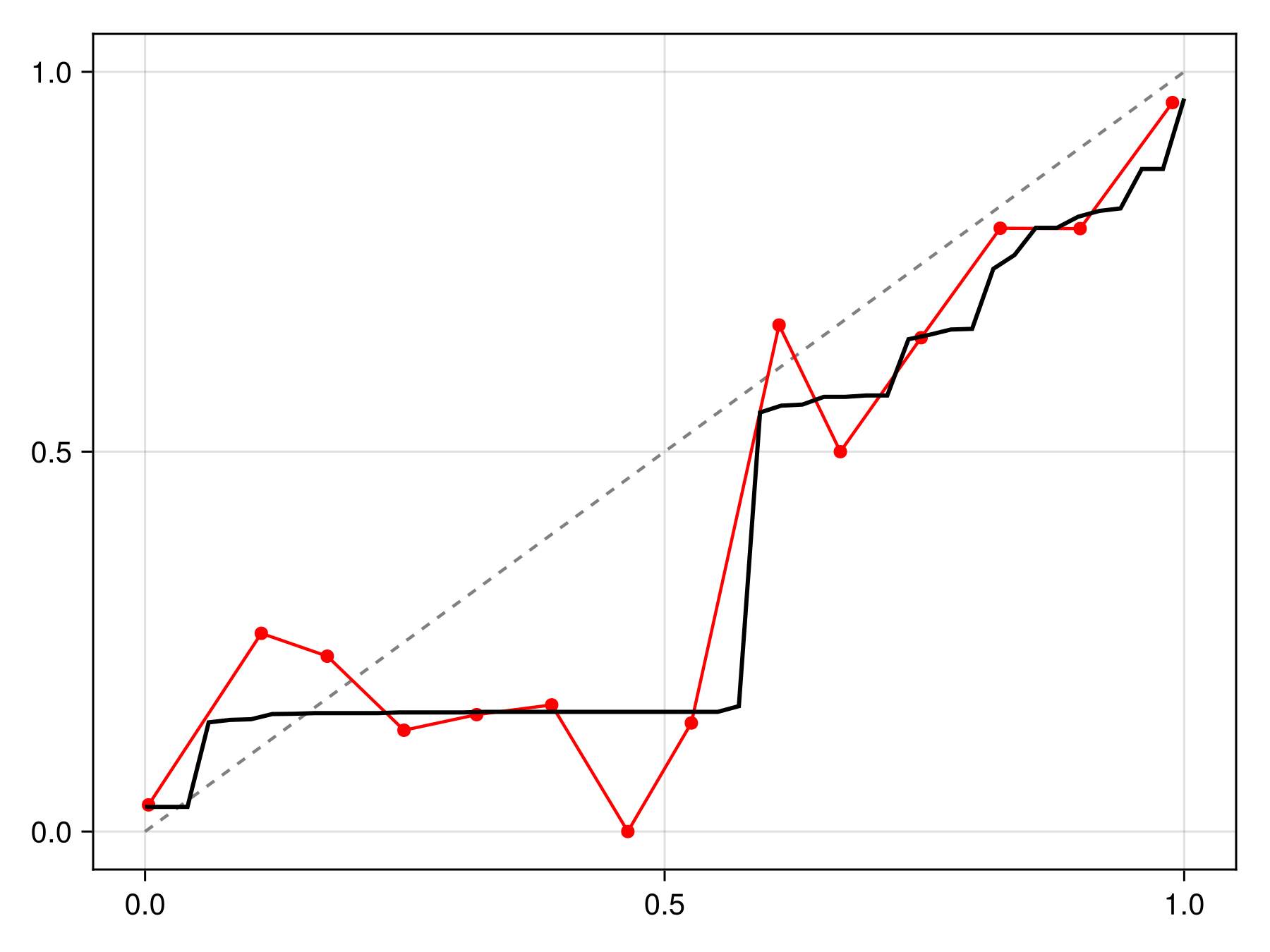 scatterlines!(ax, reliability(sdm, bins=15)..., color=:red)We can apply different types of calibration functions, such as for example isotonic regression: