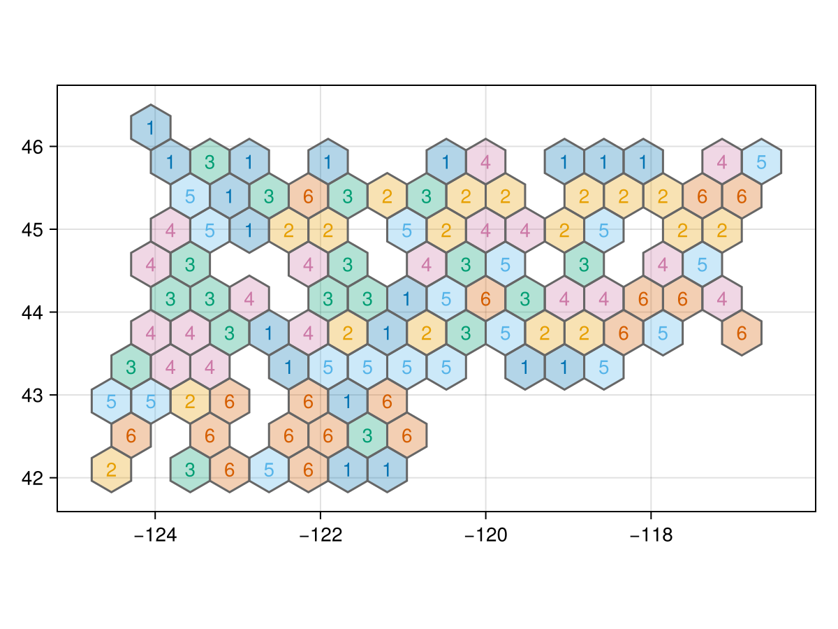 tiles = tessellate(model, 20.0; tile = :hexagons, pointy = true)FeatureCollection with 109 features, each with 4 properties