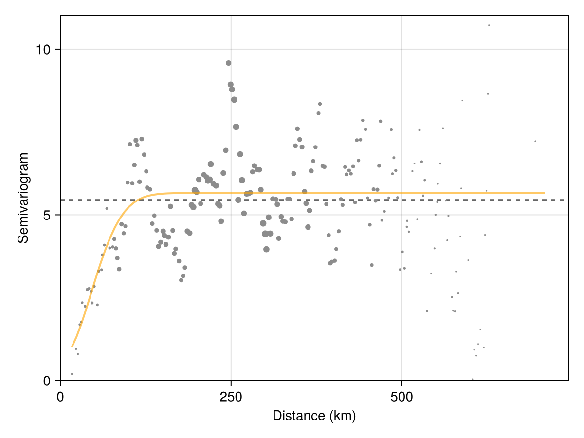vario = SpeciesDistributionToolkit.fitvariogram(x, y, n; family = :gaussian)(sill = 5.658900323073887, nugget = 0.6785190841053046, range = 110.44888993154616, error = 1.3313725982256805, model = SpeciesDistributionToolkit.var"#__mod#__variogram_gaussian##0"{Float64, Float64, Float64}(5.658900323073887, 0.6785190841053046, 110.44888993154616))