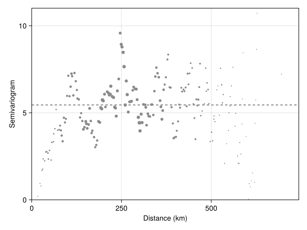 ax = Axis(f[1, 1]; xlabel = "Distance (km)", ylabel = "Semivariogram")