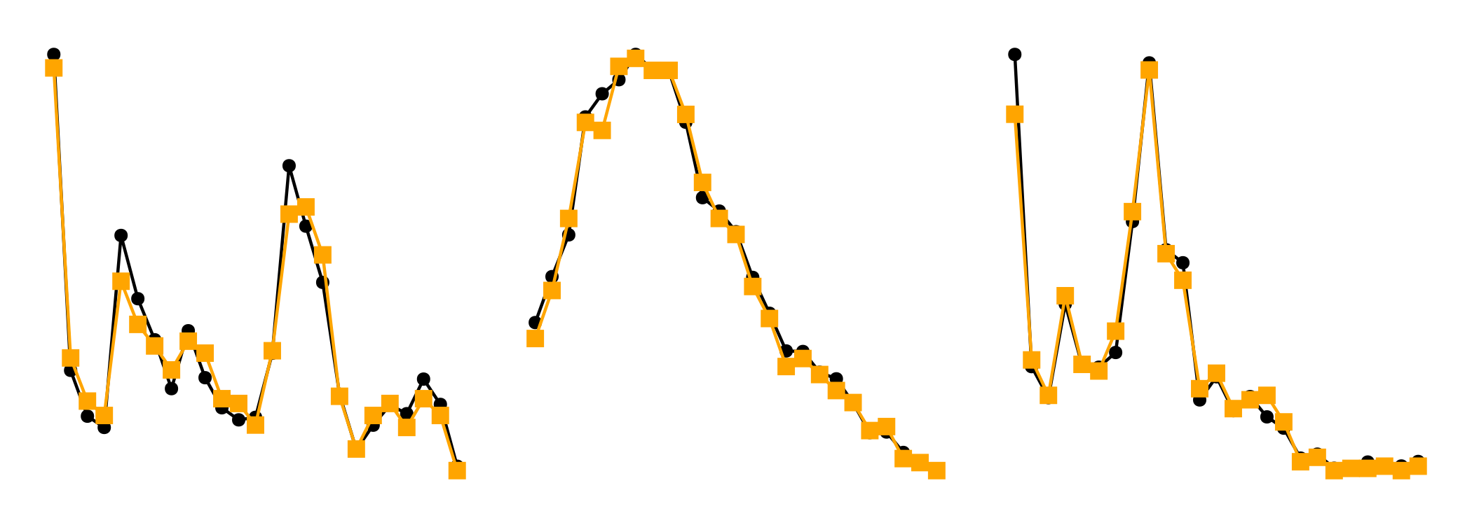 For the intra-specific distances, with observations in black and the simulation in orange, this looks like: