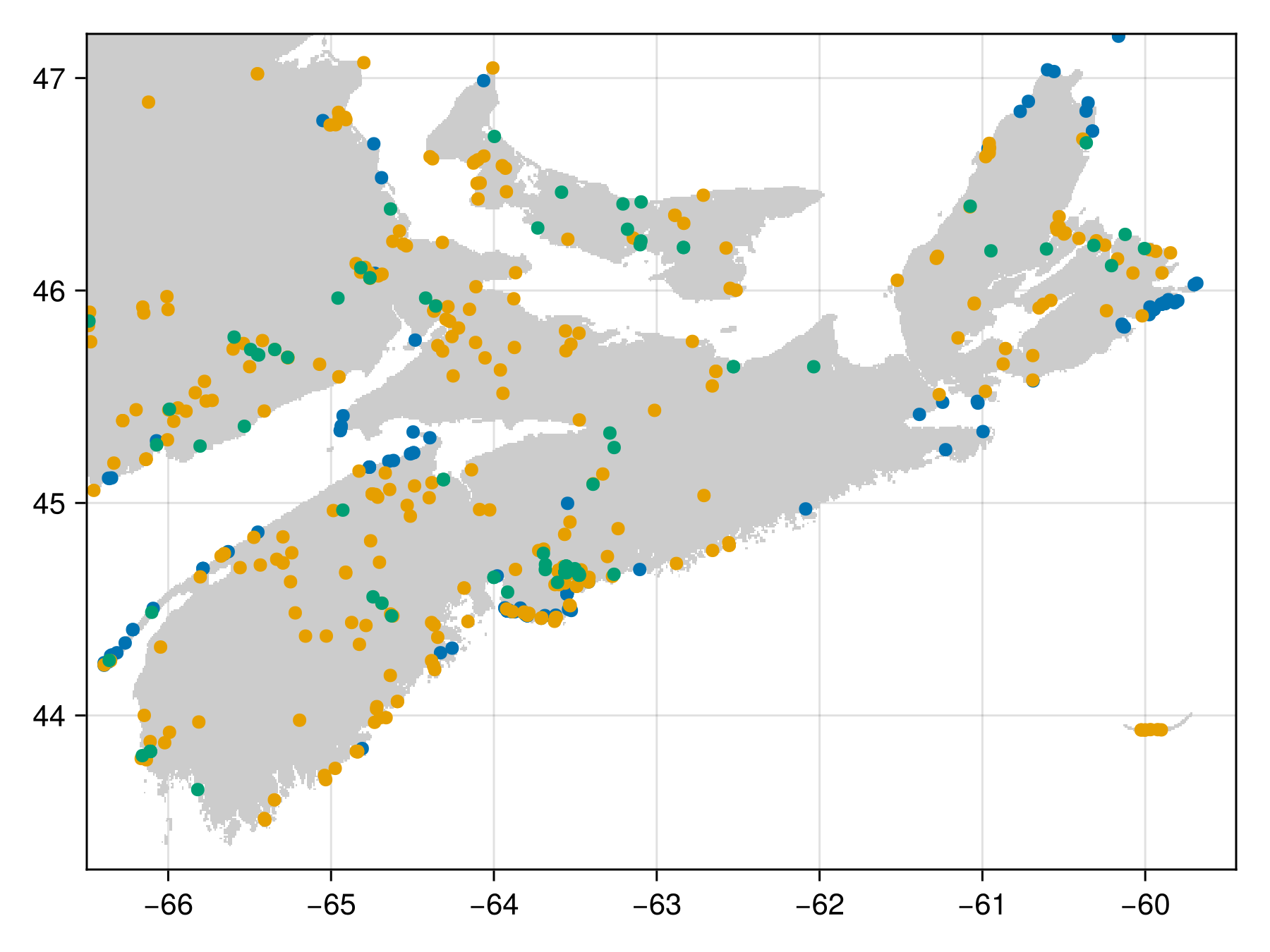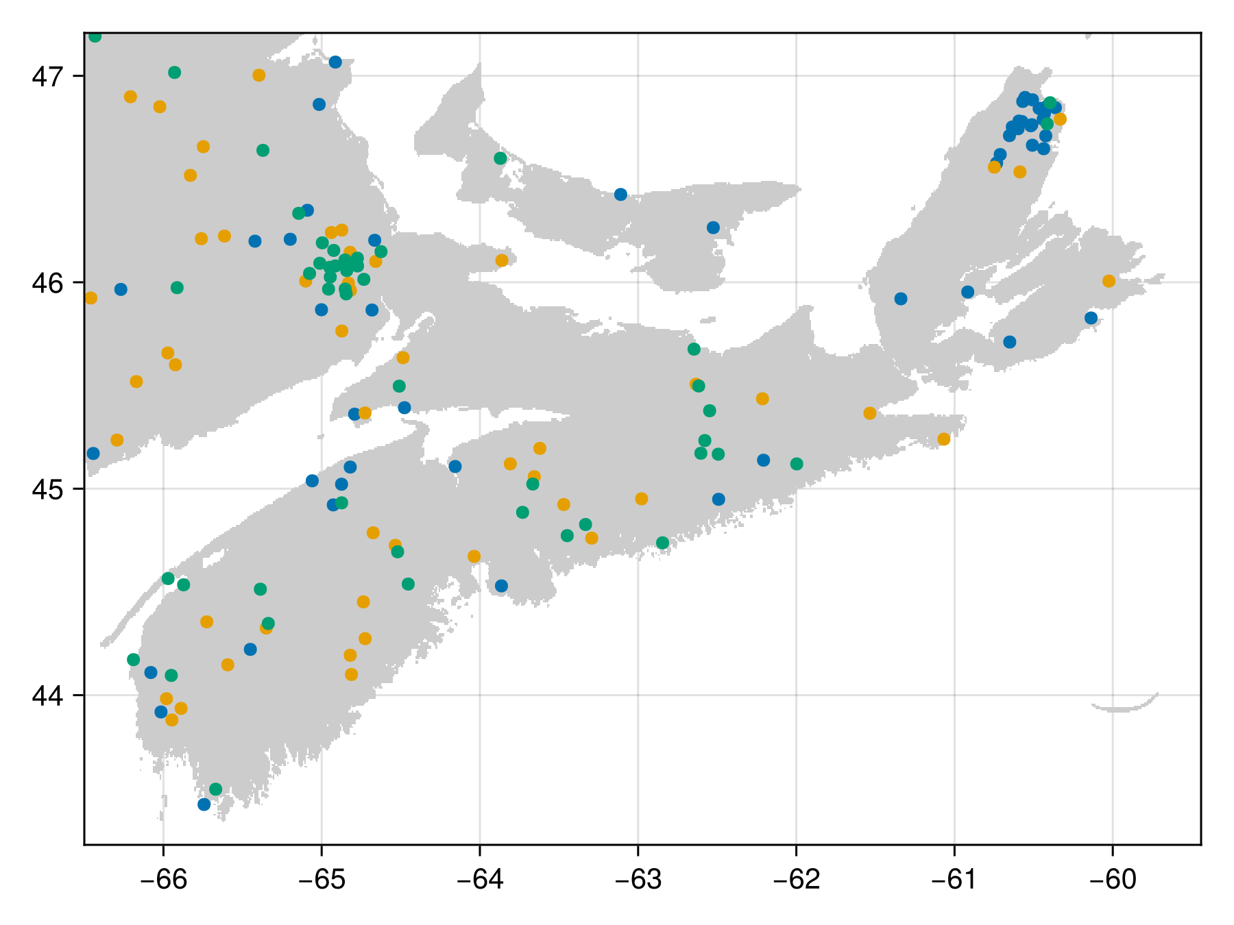 Get the observation data in the correct format, which is an array of matrices with two rows (longitude, latitude) and one column for observed occurrence. This is usually an array of observations that are a subtype of AbstractOccurenceCollection (data returned from the GBIF package work), but all that matters is that this is a matrix with longitudes in the first row, and latitudes in the second row. The matrix has to be column-major, with observations as columns. To make sure that we cover a reasonable spatial extent, we will look at the rather small area in space (part of the Gaspésie region):