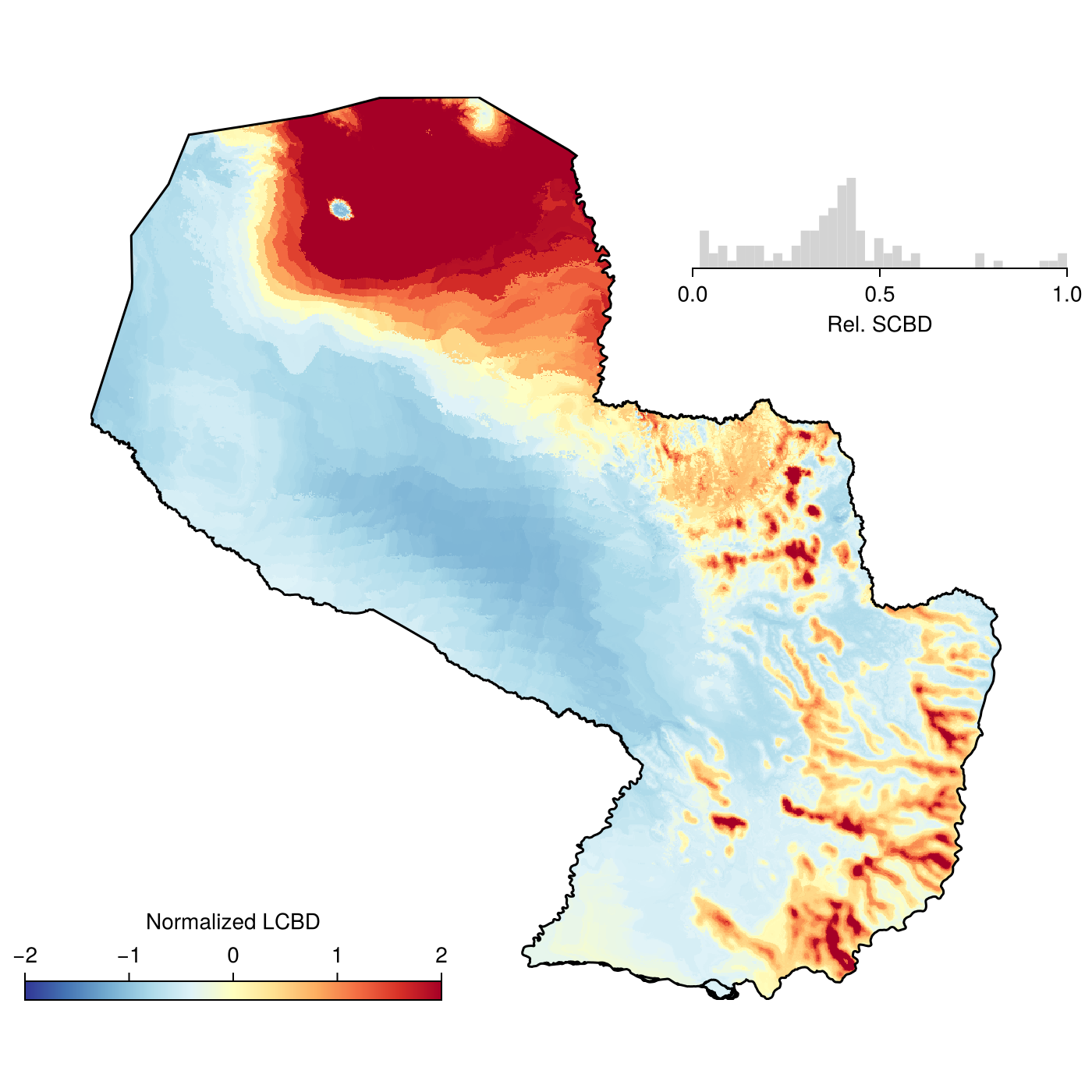 βl, βs, βt = LCBD(ranges; transformation = hellinger)(🗺️ A 999 × 1007 layer (508483 Float32 cells), [0.011765526139563963, 0.026842756420192484, 0.012211850943168465, 0.0022973187958042376, 0.0011018562297433292, 0.010689757118200333, 0.010313793456761174, 0.0032287498480885863, 0.011499837865380162, 0.00833603352174186, 0.020906805494785262, 0.014555548573161792, 0.009550090522714272, 0.008233559418893057, 0.011436932724780923, 0.00891940693630012, 0.0043838645100910244, 0.0006889880488489053, 0.014720183422466032, 0.008759694044861148, 0.01045273627179423, 0.0032339464910429066, 0.012855639243297285, 0.004069619480299629, 0.02496919262234288, 0.0072541208374752525, 0.011486468975501237, 0.003670409734778589, 0.004800298766877761, 0.009482367591992363, 0.013074528125891357, 0.010265578375060955, 0.008145207341236244, 0.005909663913640062, 0.011138478948093153, 0.011560049562741483, 0.0065751962335590395, 0.026724333831493707, 0.0039029780545962586, 0.011041911491321462, 0.015567716972960364, 0.008460613283847418, 0.015945752587718152, 0.009424887692615569, 0.0012090244763974867, 0.011345970726481143, 0.013630089663844503, 0.008409359630606272, 0.01085312961724366, 0.001026884387908743, 0.010719279463718819, 0.011123493601932093, 0.0022333596042957977, 0.009612032118580888, 0.011920795835575735, 0.007305673828106455, 0.010318713950680855, 0.011313507440150004, 0.009507676757456292, 0.012032130689058097, 0.007564777178394499, 0.005966619146673527, 0.0023501120799297405, 0.014259842889336296, 0.013850236531382981, 0.020533861329303515, 0.0106432352815318, 0.010967135637866691, 0.0015993369171748175, 0.007914483886615161, 0.009438342507476556, 0.010236628945323756, 0.014873618545677288, 0.013309760609278716, 0.01160037307142353, 0.00930039339089494, 0.02577060351013607, 0.010763402598156734, 0.009999830123275086, 0.021669483409308212, 0.0026631077900581015, 0.010870075106619257, 0.0049759484888276685, 0.012184590642677968, 0.011108810090272139, 0.007799845598852312, 0.01603235344894764, 0.009048949489331189, 0.010343465453425396, 0.005512507913422314, 0.013271782319392555, 0.01085442202874547, 0.004558915893028969, 0.011341196497628258, 0.0009913192012942656, 0.011488157454824689, 0.01035787487511841, 0.01057690405977546, 0.0005089862536992864, 0.009883337547137402], 0.36796185798842773)We can now plot the various elements (most of the code below is actually laying out the sub-panels for the plot):