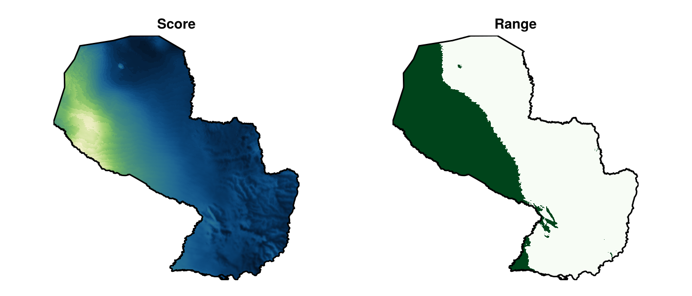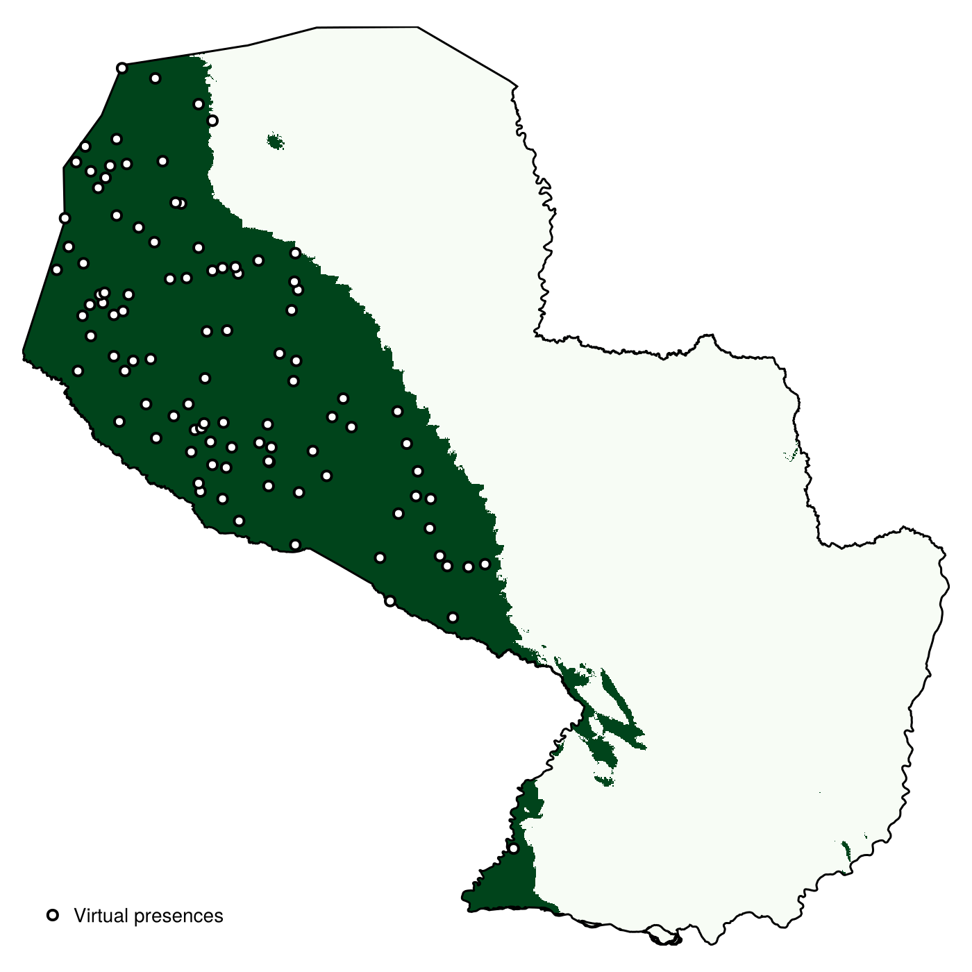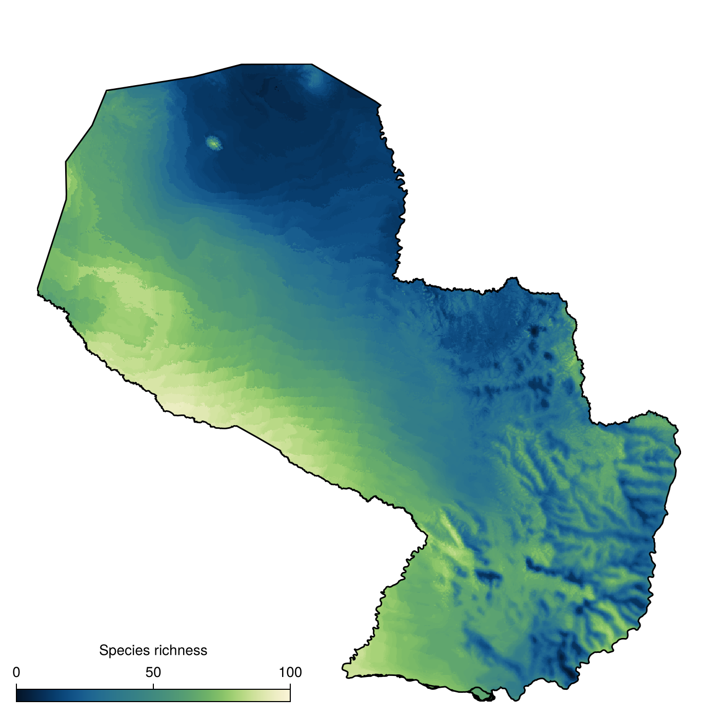 using StatisticsWe start by defining the extent in which we want to create the virtual species. For the purpose of this example, we will use the country of Paraguay. Note that the boundingbox function returns the coordinates in WGS84.