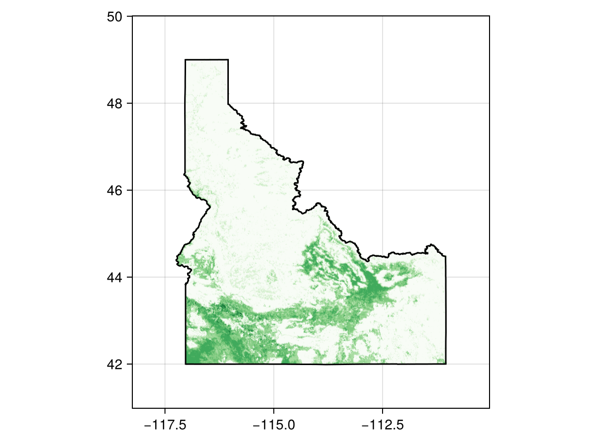 using CairoMakieIn this tutorial, we will mask a layer using information from a polygon, then use the same polygon to mask occurrence records.