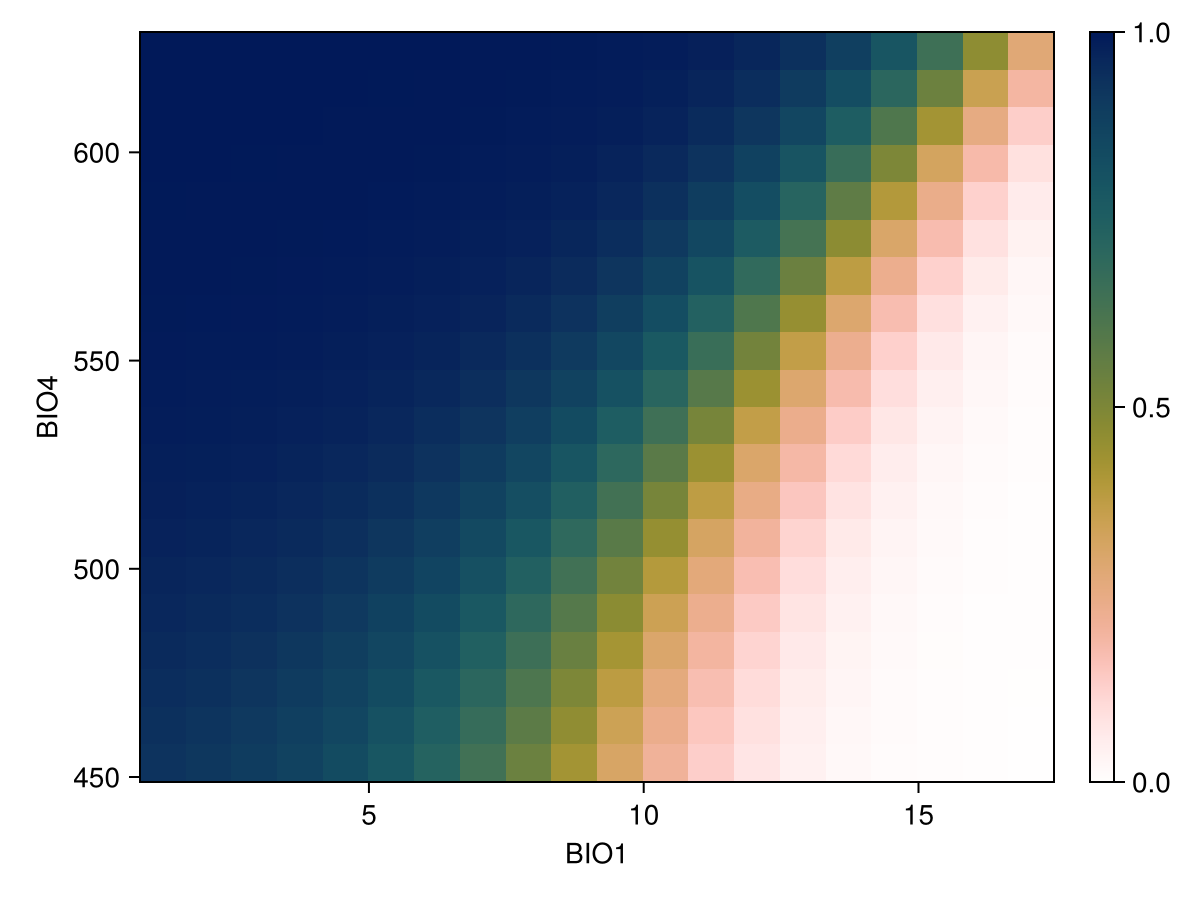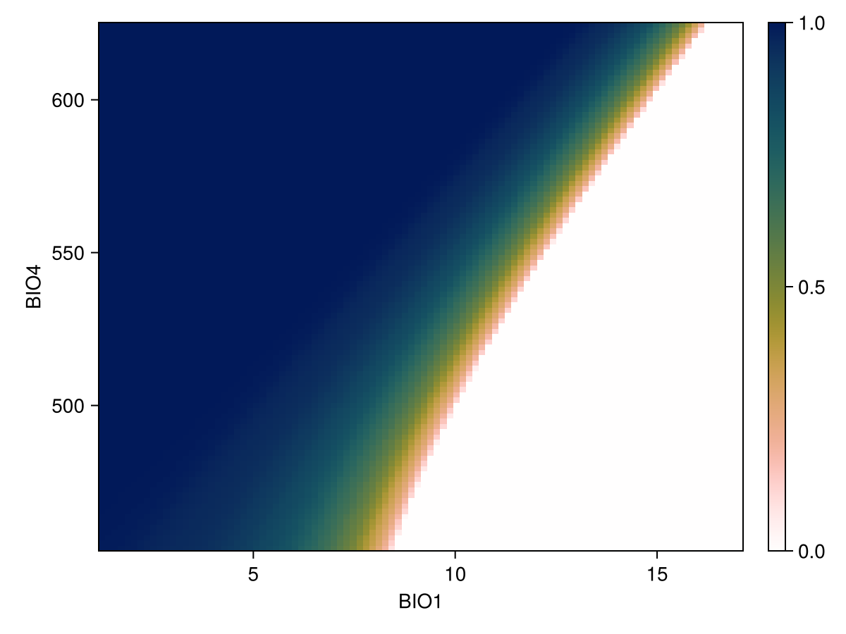 lines!(ax, px, py; color = :black)We can also produce it for two variables, using the same syntax as before. Note that in this case, we look at the prediction of the model with a threshold, so the resulting plot will indicate how strongly the model would predict the presence of the species for a pair of values of these two variables: