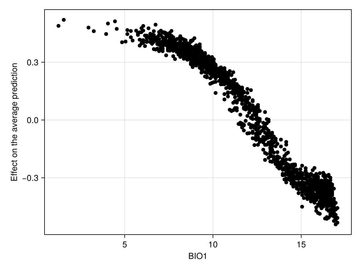 ax = Axis(f[1, 1]; xlabel = "BIO1", ylabel = "Effect on the average prediction")