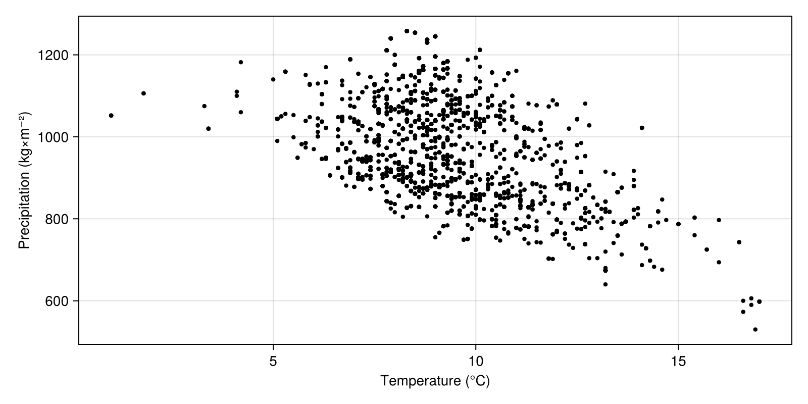 Axis(figure[1, 1]; xlabel = "Temperature (°C)", ylabel = "Precipitation (kg×m⁻²)")